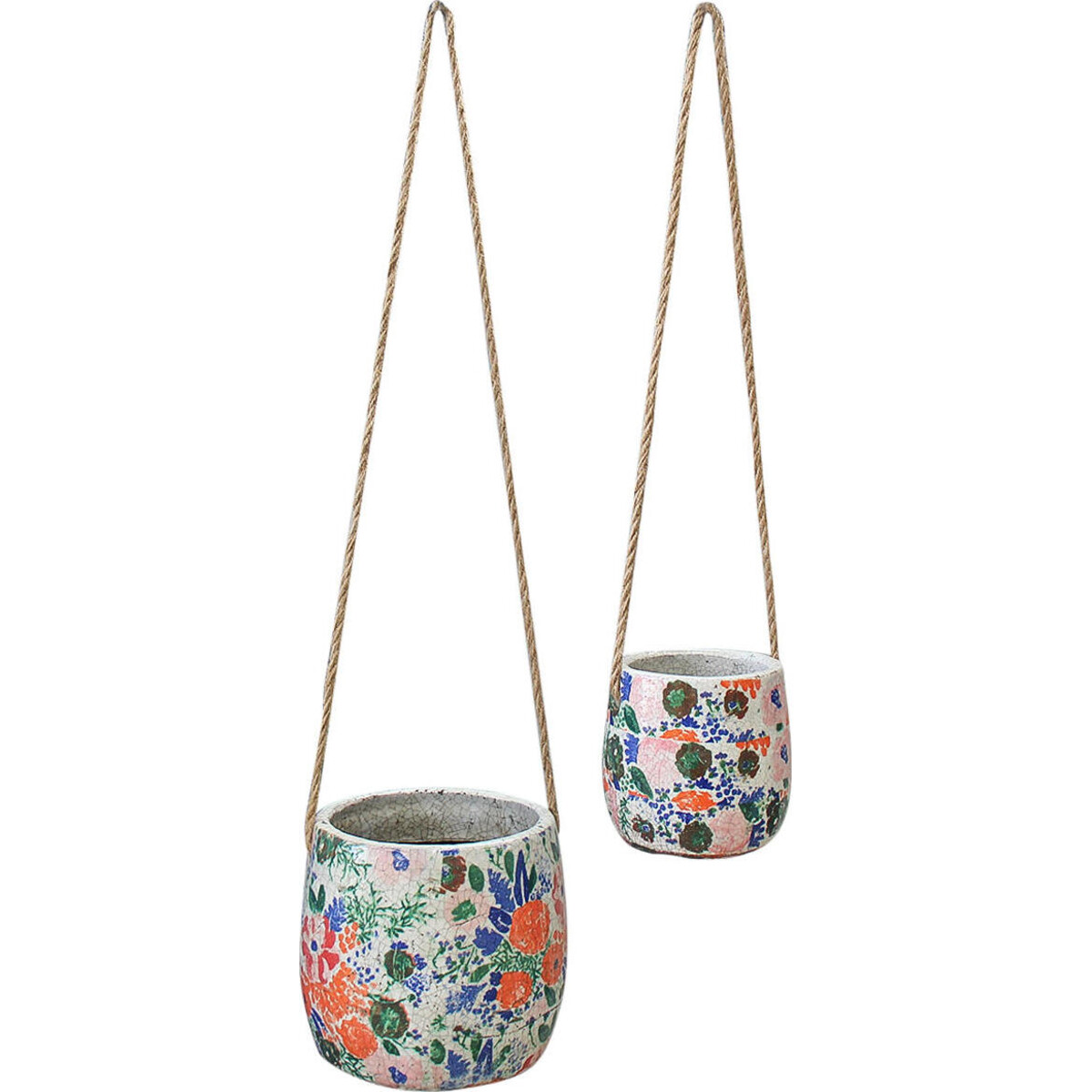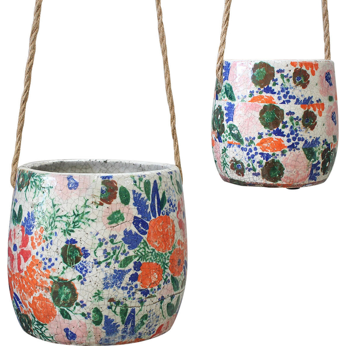 These beautiful hanging pots have a ceramic, stoneware and rope construction, a lovely floral design with a cracked tile textured finish. These will look elegant hanging in the balcony, bedroom, porch, patio or garden of a countryside home, traditional home, rustic style apartment or even in a bathroom. Where ever they are placed, this set of ceramic planters strike bowl-shaped silhouettes and create a high-flying botanical display anywhere.
