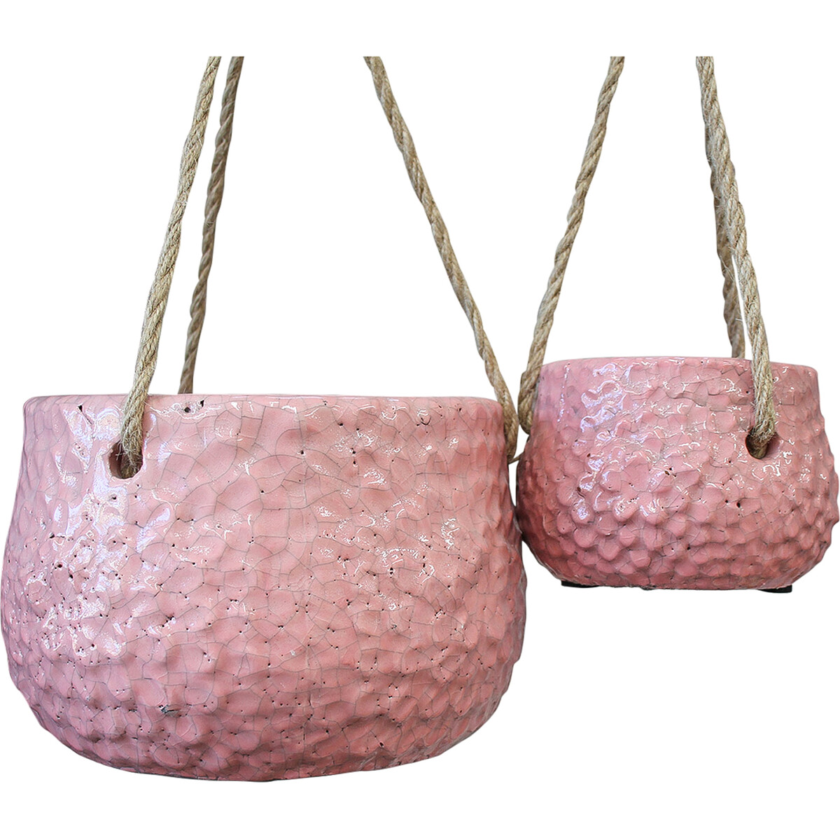 It will grace your window space or your balconies - helping save on floor space and making the display of your potted plants ever so interesting and unique. The set has two sizes - the larger one is 19 cm in diameter and 14 cm in depth while the smaller one is 11 cm in dimeter and 9 cm in depth - thus making it such a delightful means to give small or larger plants a more homogenous kind of display. The ceramic body is easy to wipe clean to keep them looking bright and fresh as new. The soft colour makes them all the more appealing. The colour of the planter is summery fresh and you could use it in spaces that sport that summer fresh palette. The rope hangers are slotted through the slots created on the body of the planters and are knotted on top to give the planters more balance. Easy to hang and display - they will bring to your garden space the look of easy breezy cottage charm.