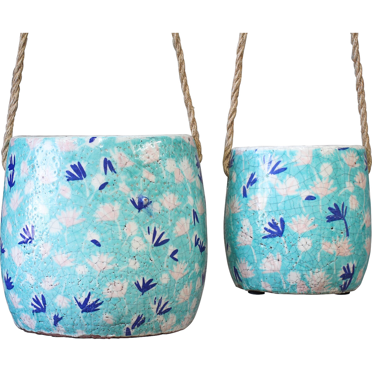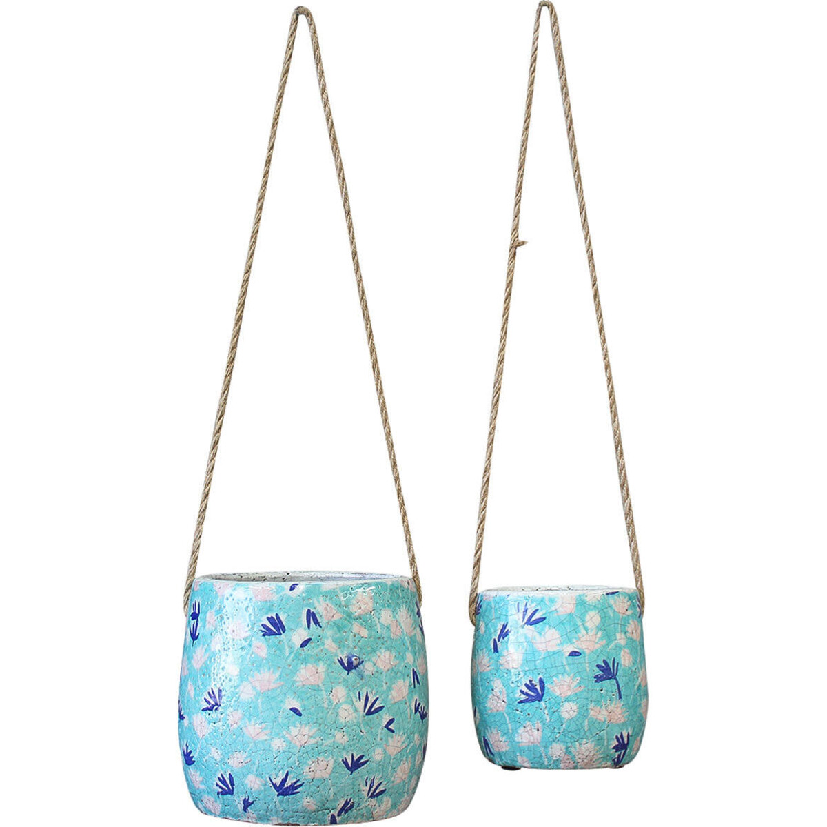 Redefine the manner in which you display your precious little greens. After all, while plants need all the love and care you could give them but they also need the perfect vantage point where their beauty is best seen from. Here is a great means to give your pots that hanging space where they could be admired in all their beauty. The set of hangable pots are blue and white - created from expertly made ceramic that has been given a pretty pattern and a texture making them as attractive as the green beauties you would be placing in them. The two in the set are sized differently - the larger with a depth of 18 cm and the smaller at 13 cm makes them a perfect team. The ropes that are slotted through the given them that necessary support and balance that even under windy condition, they will not swing too much or lose their balance. Sturdy in built and easy to wipe clean, their textured look will create that spot of beauty in your already gorgeous garden setting.