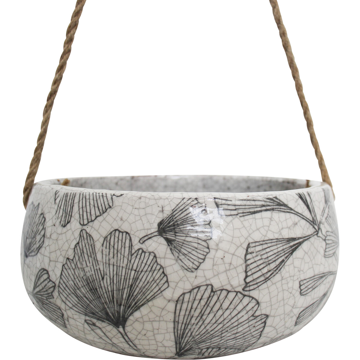Did you know that the gingko biloba tree can live for over a thousand years? They live so long to the extent that there is the report of a gingko tree in China which is said to be more than 3,500 years old! Isn’t that incredible? It is therefore this same tree, which can be found across our country that influenced the beautiful exterior glazing of this planting pot. On the exterior of this hanging cylindrical shaped terracotta pot are the lovely images of gingko plant leaves rendered in black hue over a bright ash backdrop.