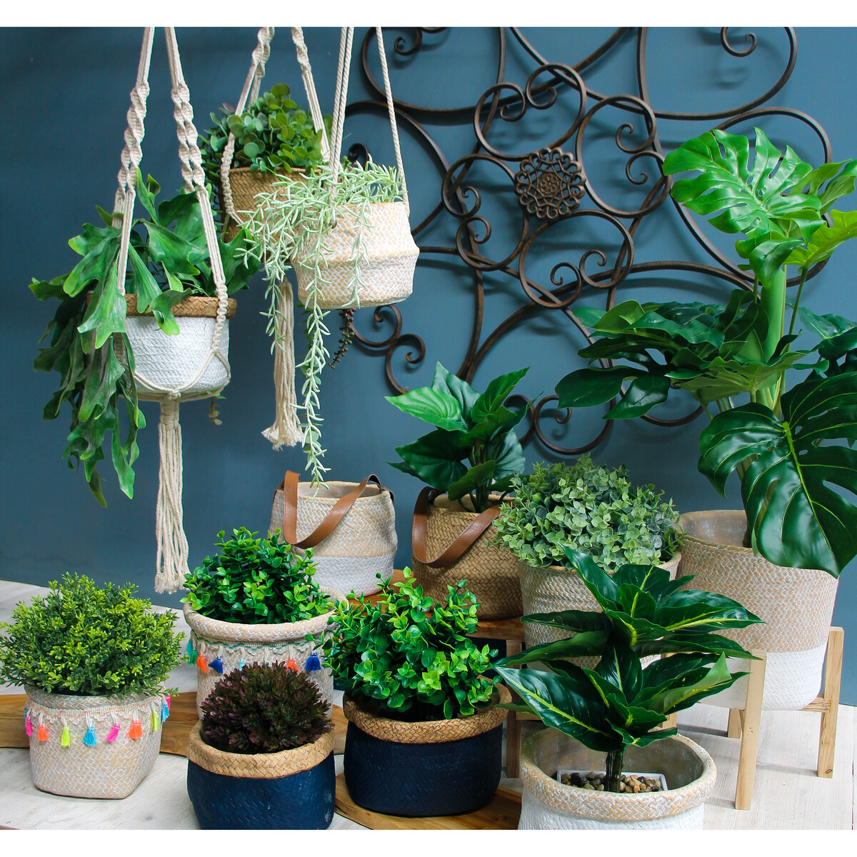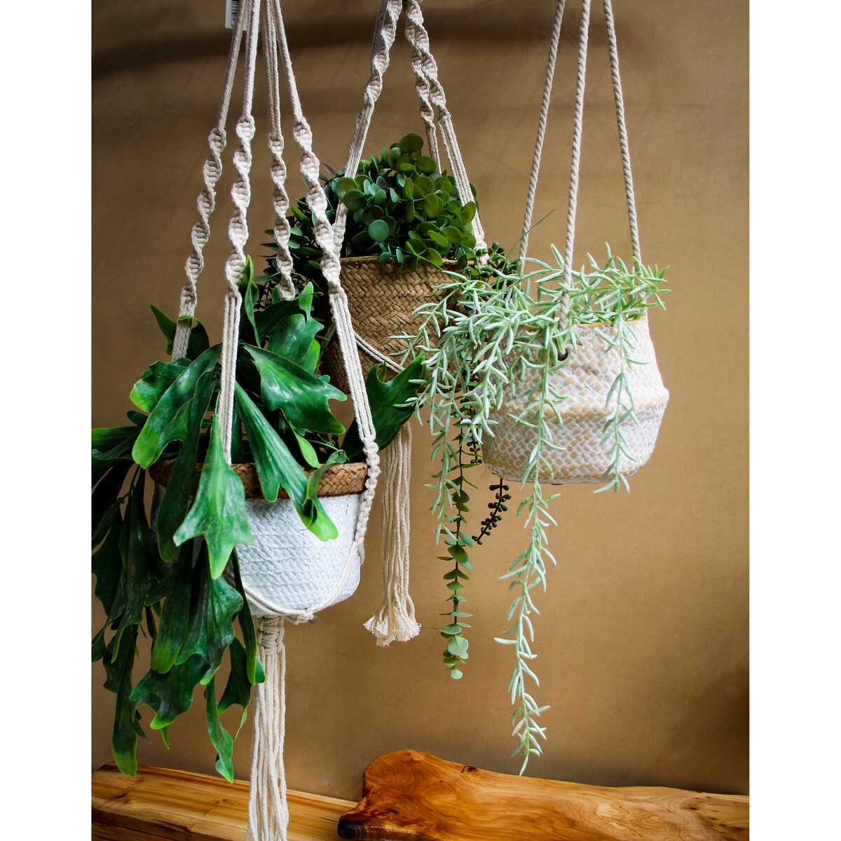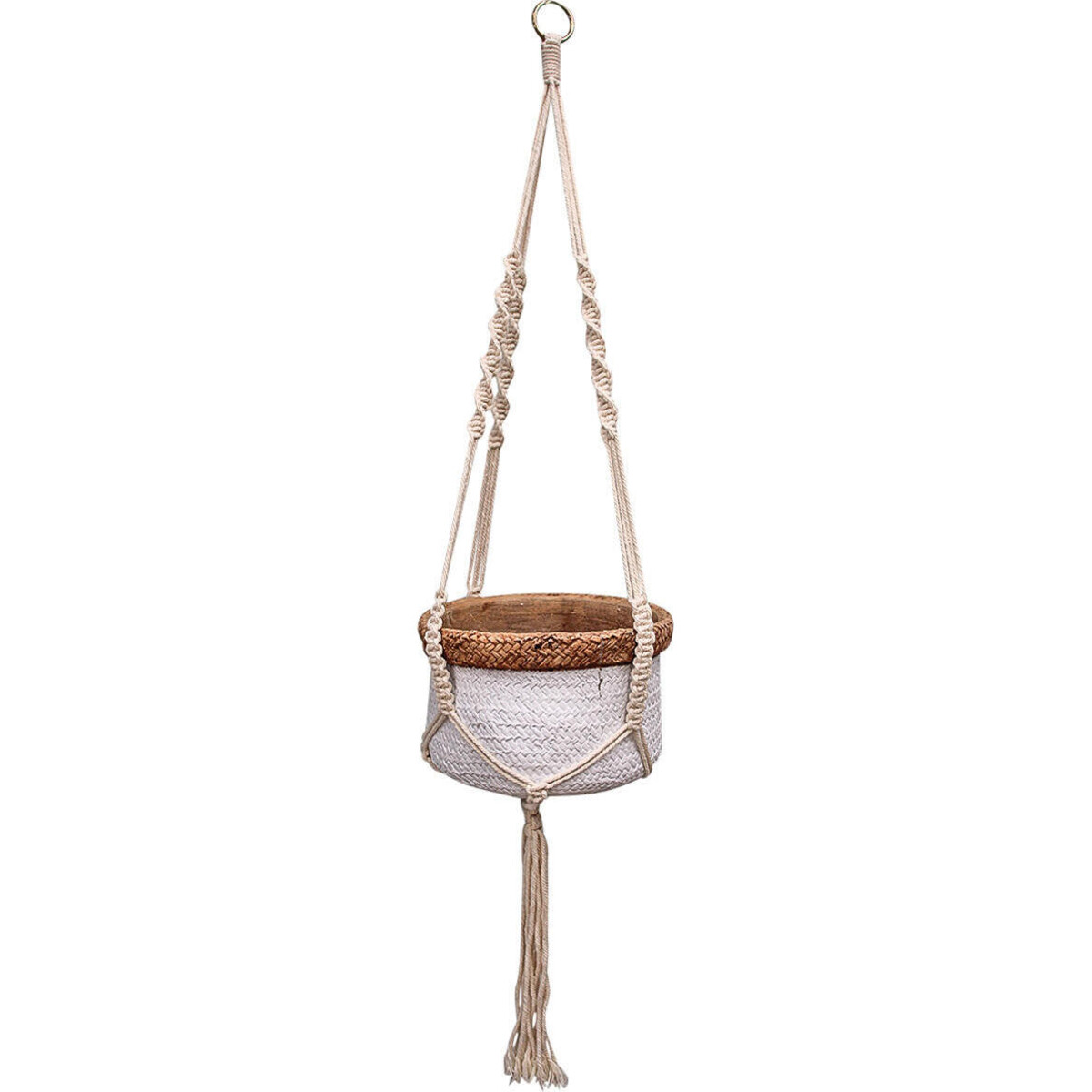Hang your favourite florals from hydrangeas to roses to tulips in charming style with this rustic yet stylish planter. With a size of approximately 19cm in diameter, 12.5cm in height, with a total height of 86cm including the macramé rope hanger, it has nice length and is sturdy enough to hold average size plants. The metallic ring on the top makes it easy to hang on a hook. Have it hanging in your backyard umbrella with citronella plants so that it works as a natural insect repellent and it will also look perfect along the wall of windows at the lakehouse!