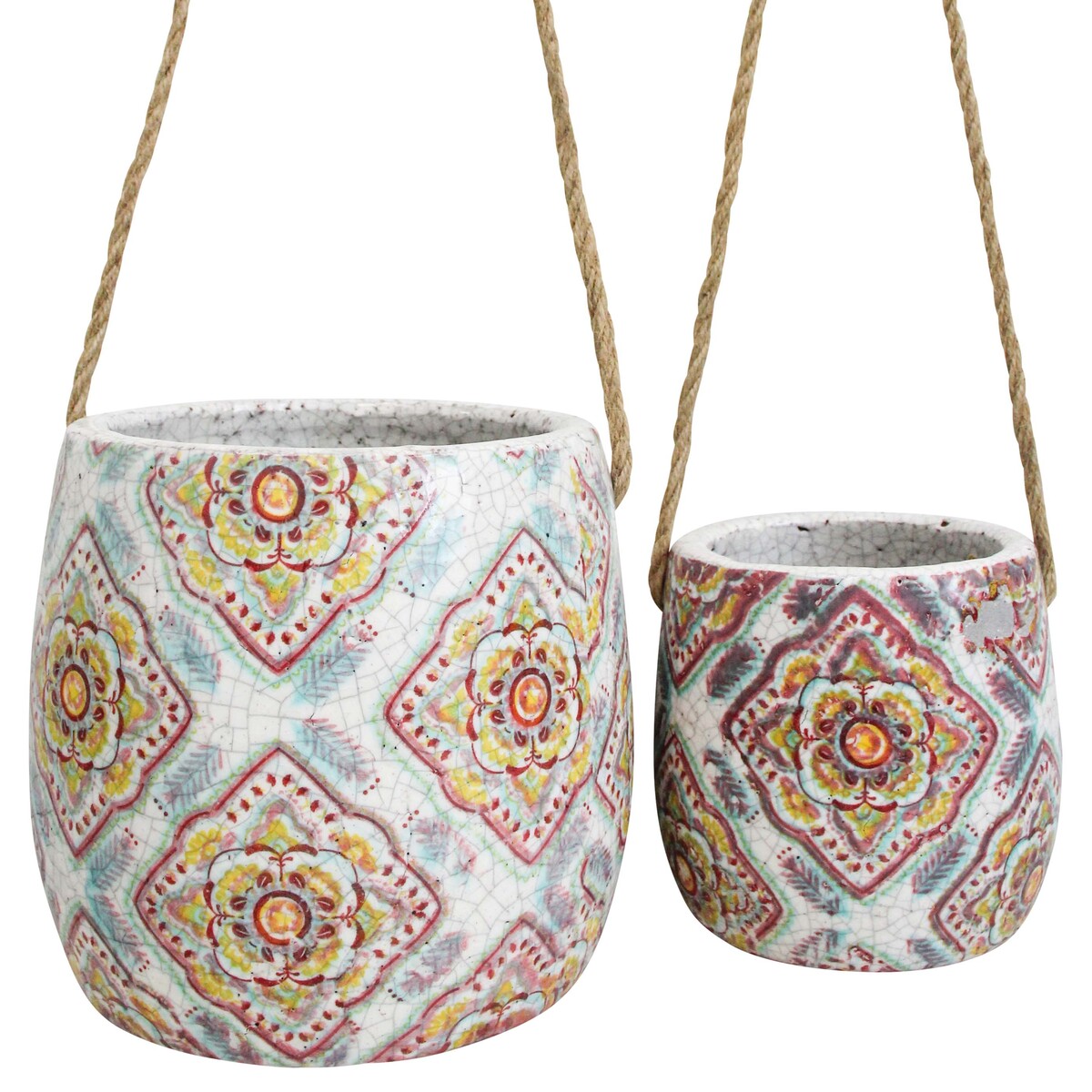 We’re really quite fond of these. Our Fiesta Hanging Pots set of two brings such a warm, cheerful vibe to any room with their riot of hand-painted colour and crackle glaze finish. Customers looking for that perfect eclectic boho accent are always quite taken by the intricate floral mandala motifs and charming vintage-style finish. They’re crafted from terracotta - so have a nice solid feel - and the rustic jute rope just adds another layer of texture to an already really tactile piece. We love how this set works with basically any decor scheme that’s missing a splash of whimsy and is especially great for hanging plant-lovers short on bench or shelf space.