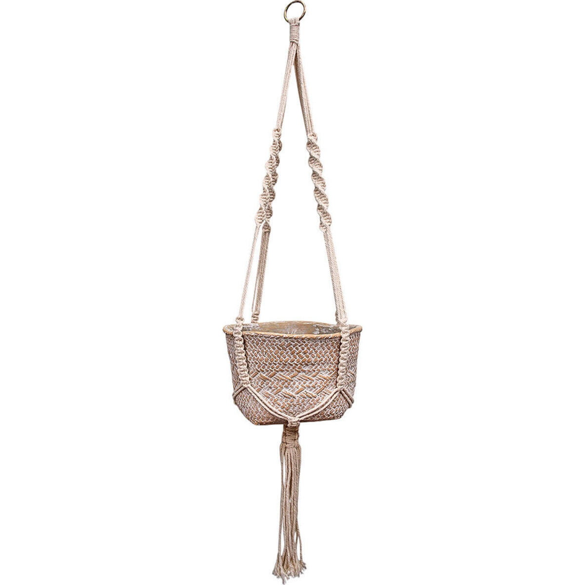 Perfect for suspending from the ceiling near a window, it creates a beautiful home for your favourite plant and is ideal for flowering and vegetable plants, greens and herbs or ferns and succulents. There is a metal ring on top of the planter for easy hanging from a hook in the ceiling or a large nail on the wall. This twisted macramé holder with pot is an eclectic addition to any indoor or outdoor garden - or a thoughtful gift for those who matter the most!
