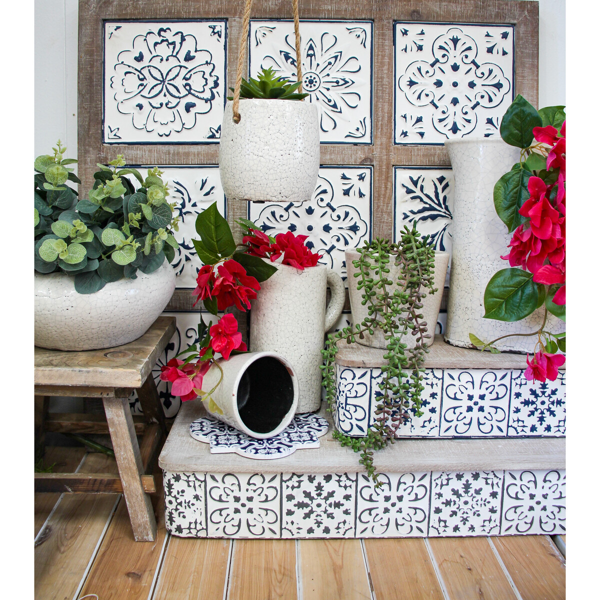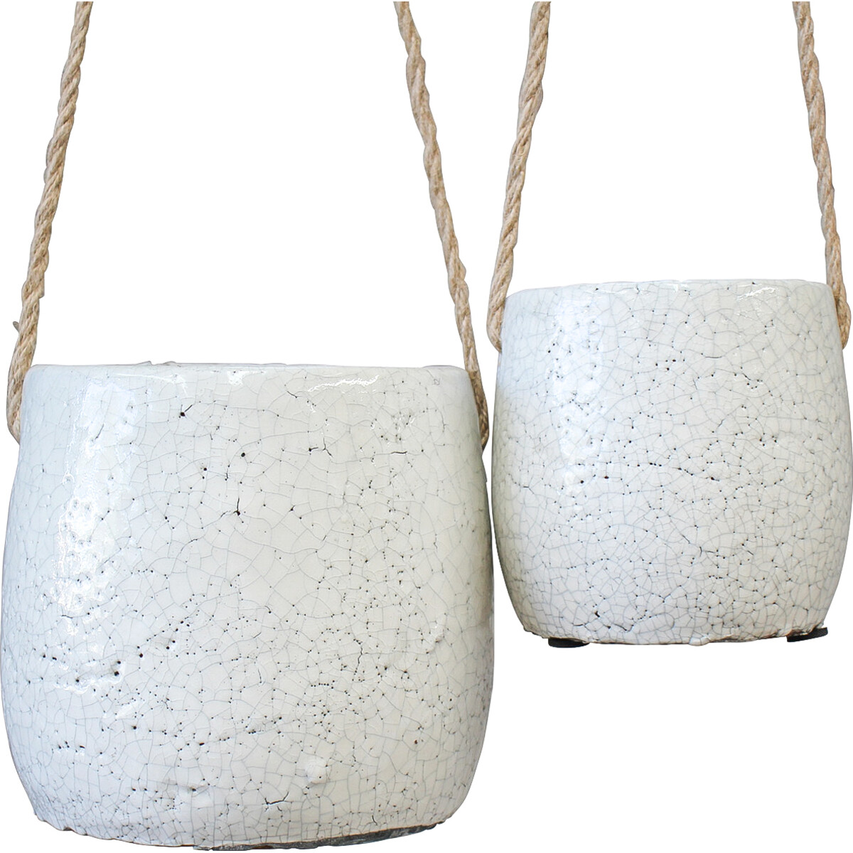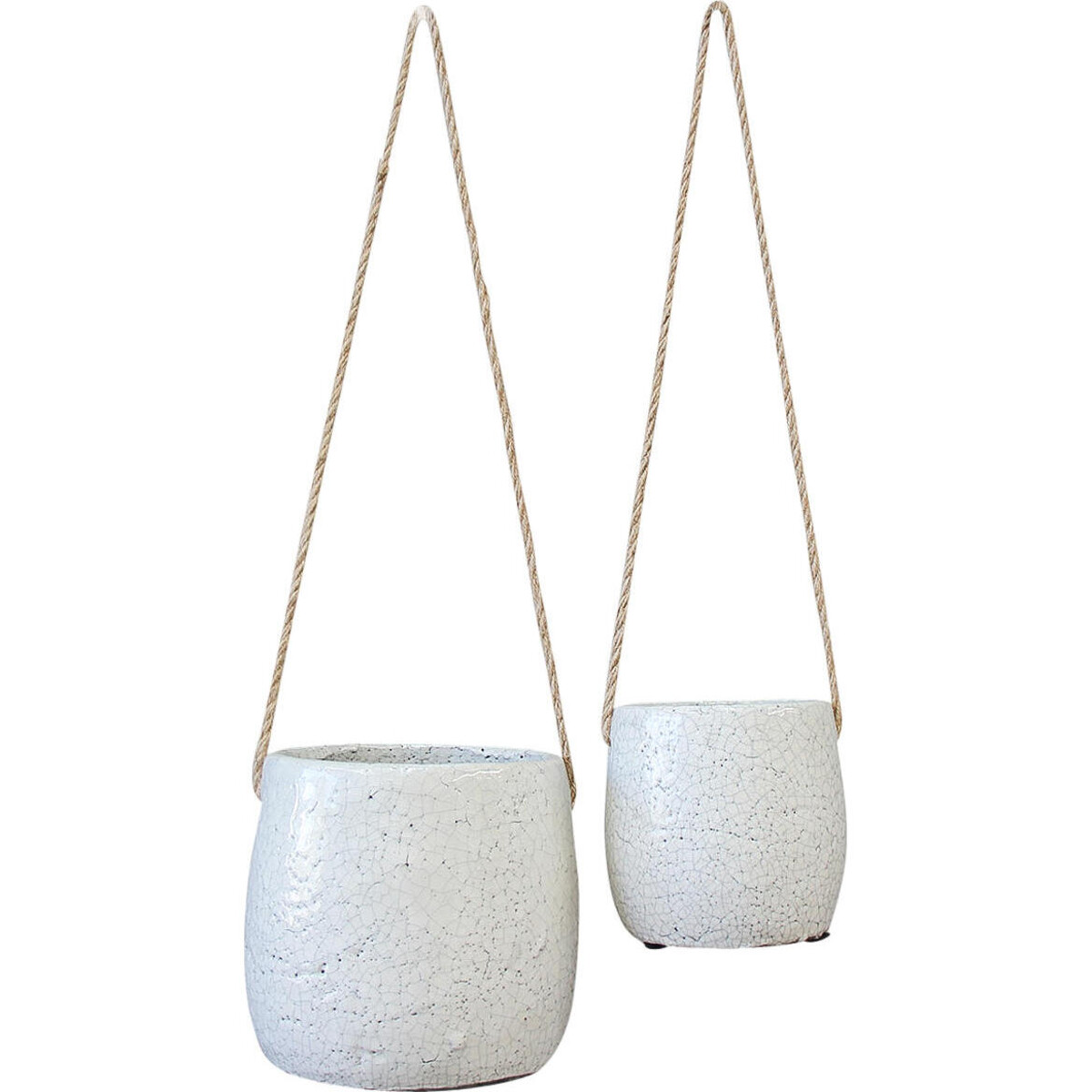 They are both off white in colour - the speckled design they display will add to the beauty of what you display in them - be it natural foliar or flowers that are not so natural - hanging them from windows or balconies will invite that freshness to appeal to your spaces. The larger of the two pots is 16 cm in dimeter while the smaller on is 14 cm - the hanging strings it comes with are sturdy and will give ample support to the pots even when loaded with the soil and the plant in them. Will look delightful when placed amongst your garden greens or when hung from posts up in the terrestrial garden helping create levels in the manner in which you display will look far more attractive. The white coloured ceramic pots are deep and will give even the deep - rooted plants the much - needed soil base.