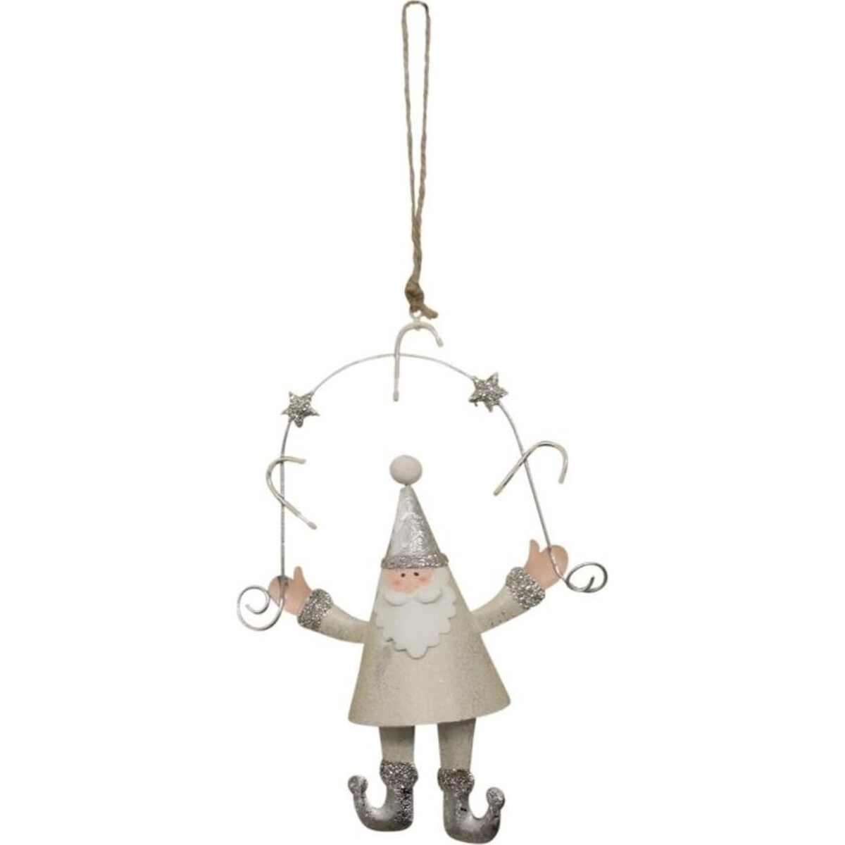 He seems to be alighting - as if from heaven above - bringing the message of peace and love. All he has in his hands is the bent bough of some tree that seems to be softening his landing as he comes to visit you. His cane is just within his reach and the pointy hat and the boots gives away his intention to carry on with his old kind of dressing. This charming Santa figurine while being most recognizable I also truly unique in its look and will endear itself to your heart immediately. The dull vintage white colour and the touch of glittery silver adds the touch of glamour for this otherwise very basic and plain image of Santa created here. Santa here is with a pointy hat and even more pointy boots adds that touch of magical cheer that fill us with wonder each and every year with the hope of finding the miracle of his lore. The hangable accent is 17 cm in height and about 12 cm in width.