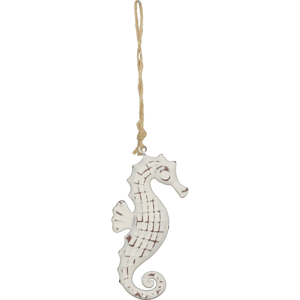 The gorgeous metal made seahorse displays shabby chic markings with a peeling paint in white. The rustic metal showing off in all of its glory and the features of the tiny little seahorse evident though all of that. Made to bring in the wonder and excitement of the underwater world filled with mysterious creatures such as the seahorse. Could be used like any other hangable or as apart of larger collective of hangable on centrepieces, and clusters. You could arrange the seahorse along the archways of windows or doors, hang them from doorknobs and any such space where there is a possibility of adding a touch of the ocean world. The string attached to the built - in slot makes this hangable an easy to use accent. Mix it up with corals and shells and you could Have an adorable highlight that would uplift the look of your theme wonderfully.