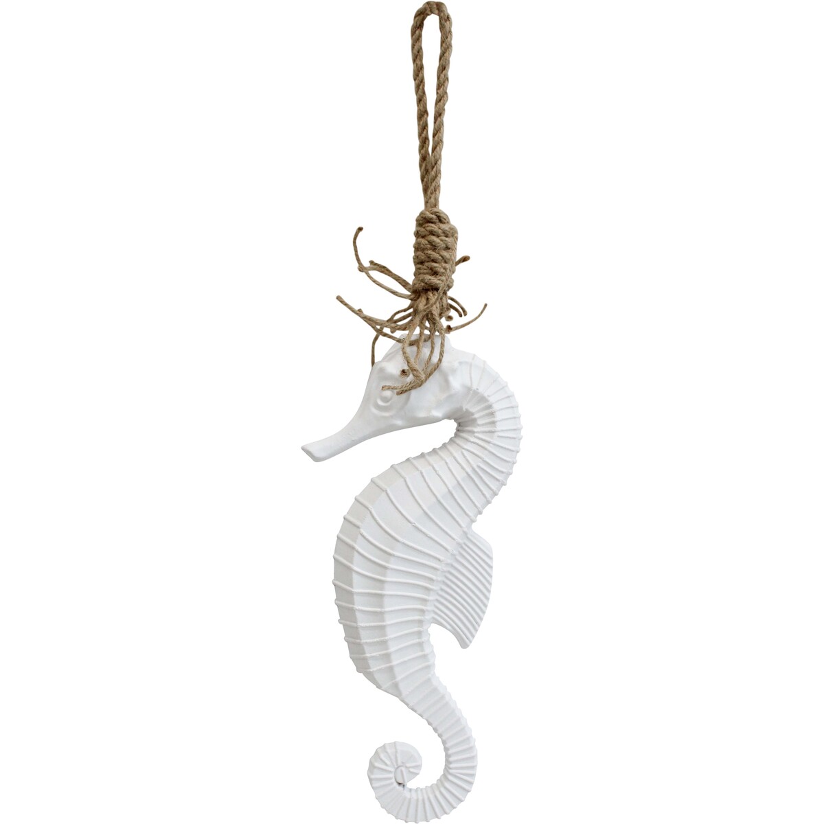 The intricate detailing of the seahorse, coupled with the rustic rope hanger, creates a striking visual contrast that adds a touch of seaside tranquillity and vintage sophistication to any setting. Perfect for hanging in living rooms, bathrooms, beach houses, or workspaces, the Hanging Seahorse White brings a breezy, nautical charm that resonates with ocean enthusiasts and decor aficionados alike.