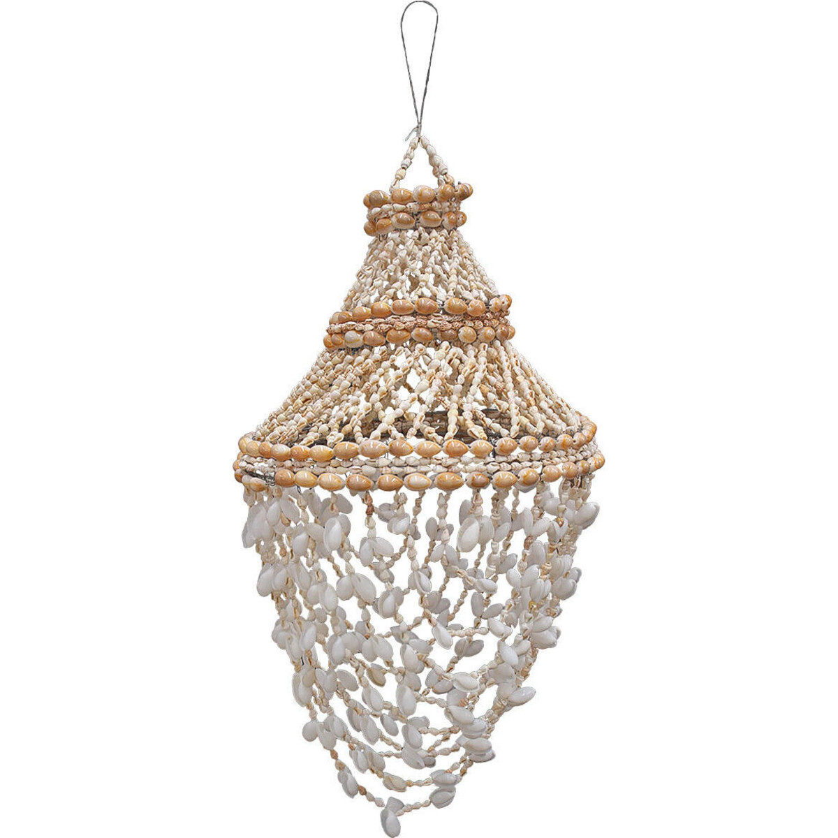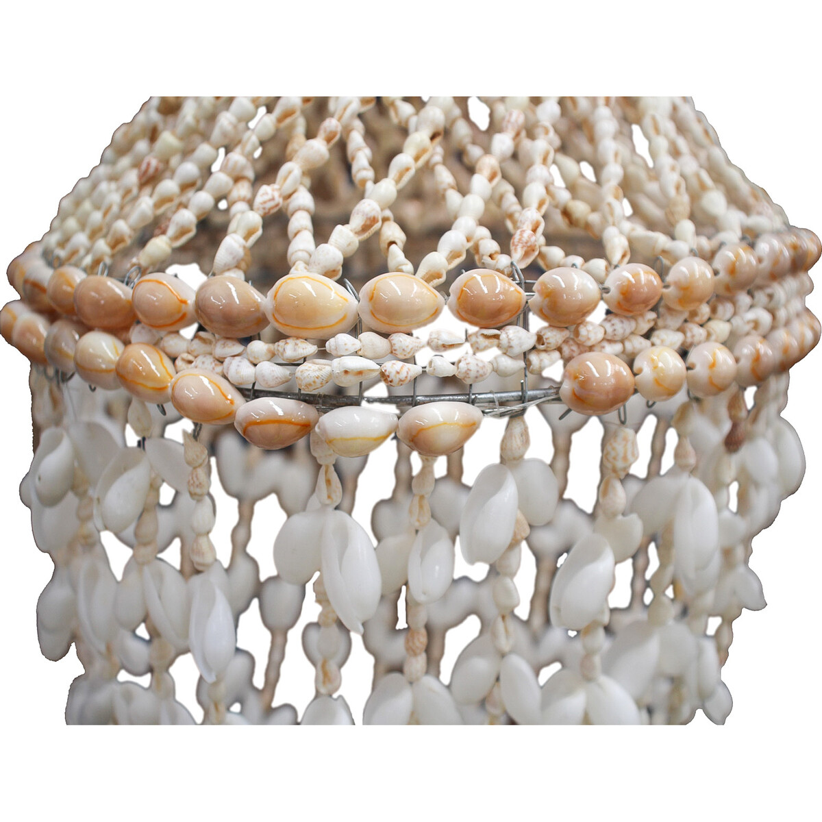 Handcrafted and decidedly one of the best means to loosen that stiff collar in your very formal spaces-this tiny hangable accents is more like a delightful chandelier created solely from shells. All sizes and hues that are sandy browns to soft pearly whites-there are multitudes of them, much like those you left behind on the shores last vacation dream away and feel the same happiness and sense of freedom when you see this beautiful piece twirl and dance its way into your heart. the length makes it a perfect foil for adding that spot of interest by the window or near the lamp. The length of this tiered shell chandelier is all of 51 cm, the base is narrower and it widens in shape along the middle. Intricate shell design with the usage of wire that has been inserted through tiny shells, is an art that has been perfected by local artisans that live by the seashore. A tribute to the beauty and the brilliance of the marine world. Can be hung with ease with the help of the loop like attachment on the top.