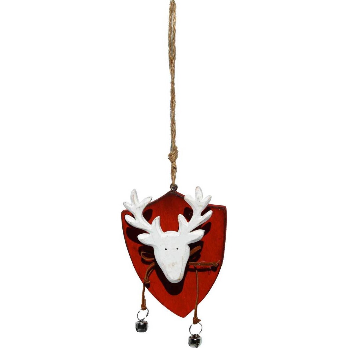 Suggestive of a hunting trophy, this Hanging Stag Head from LaVida is a little more whimsical and certainly more humane. This wooden hanging, perfect for the holidays, is crafted in wood and features a stag head painted in a distressed white finish mounted on a shield painted in deep red. A leather cord, complete with silver bells attached, is tied in a bow under the stag's head. This hanging is finished with a rustic rope loop, ready for hanging. Whether hung on a Christmas tree or added to a gift for a favourite hunter (or aspiring hunter), this hanging adds country charm to any holiday setting.