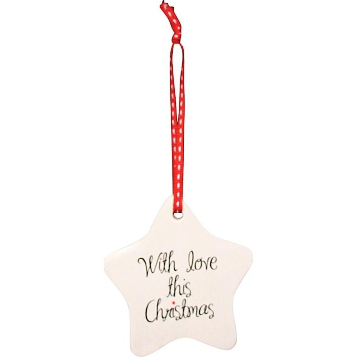Getting your home ready for the season of festivities just go a lot easier with this adorable star made of ceramic. Use it like any other hangable accent or simply give it away like party favour or keepsake. The superb finish of its texture and the lovely shape that has been crafted from ceramic adds ti its charm. Apart from that the combination of white and red and the words printed in black makes things all the more special. The ribbon in red ads to its cheeriness and allows it to eb placed on your main tree like any other hangable ornament - or it could be used as tag on large gifts and used even like an accent in doorways, wreaths, entryways and the window. After all, when getting your home in tune with the seasonal need, you can add simple and small add on such as this and make a small change make a big difference. It is a mere 9 cm in height and 8 cm in width and yet its presence is noticed instantly.