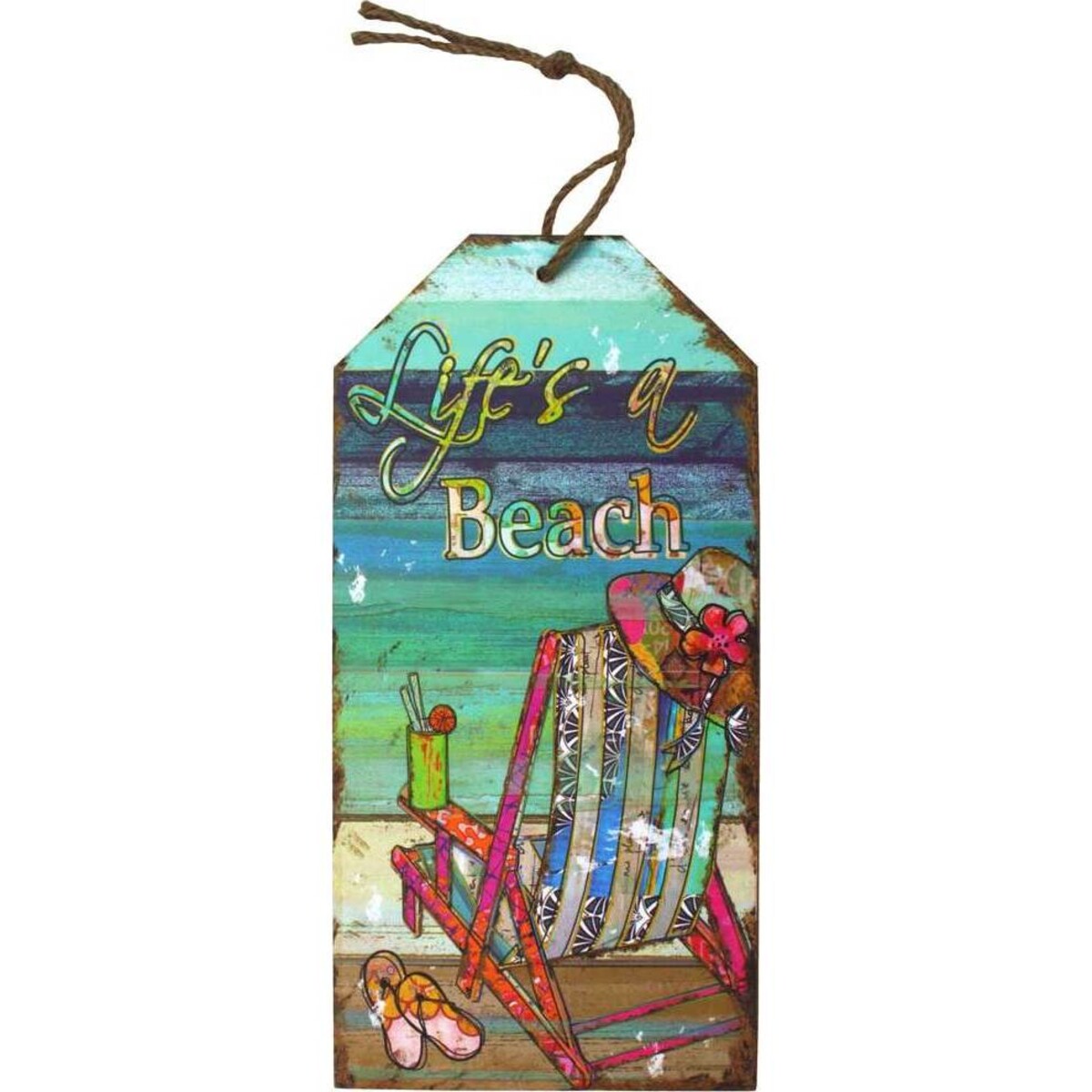 This hanging tag is perfect for homes that are close to the sea shore. It may be placed near the bar or the outdoors and then it would convey the message any beach lover would love to read anyway - life is a beach indeed - a place where the waves of time come and pass, changing the sands all around, the tide washing away all our plans and yet giving us hope for another change for the better. The one foot high tag has a beautiful and colourful graphic made on it. Very tropical and with vibrant colours all over, the print seems to have distressed colours all along the edges giving the feel of natural weathering. Beach side loungers, the sun hat, a pair of flip flops, the glass of lemonade and most important the colours of the sea in varying shades of blue, look simply gorgeous. A tag that may be small in size but very effective in its effect - it can be hung in any room that has a sea or ocean themed decor. Perfect also as a gift to anyone who loves the seaside or is a surfing enthusiast.
