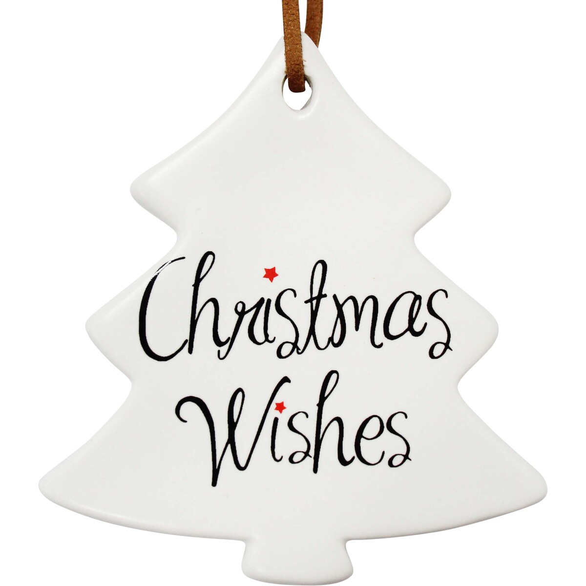 Brighten up your holiday decor with the Hanging Tree Xmas Wishes ornament, a charming addition to any Christmas tree. This dainty 8x9 cm ceramic piece, complete with a rustic hanger, showcases the heartwarming phrase "Christmas Wishes" set against a clean white background adorned with subtle red stars. Ideal for creating a warm, festive atmosphere, this ornament is a must-have for retailers looking to offer customers a touch of seasonal cheer.