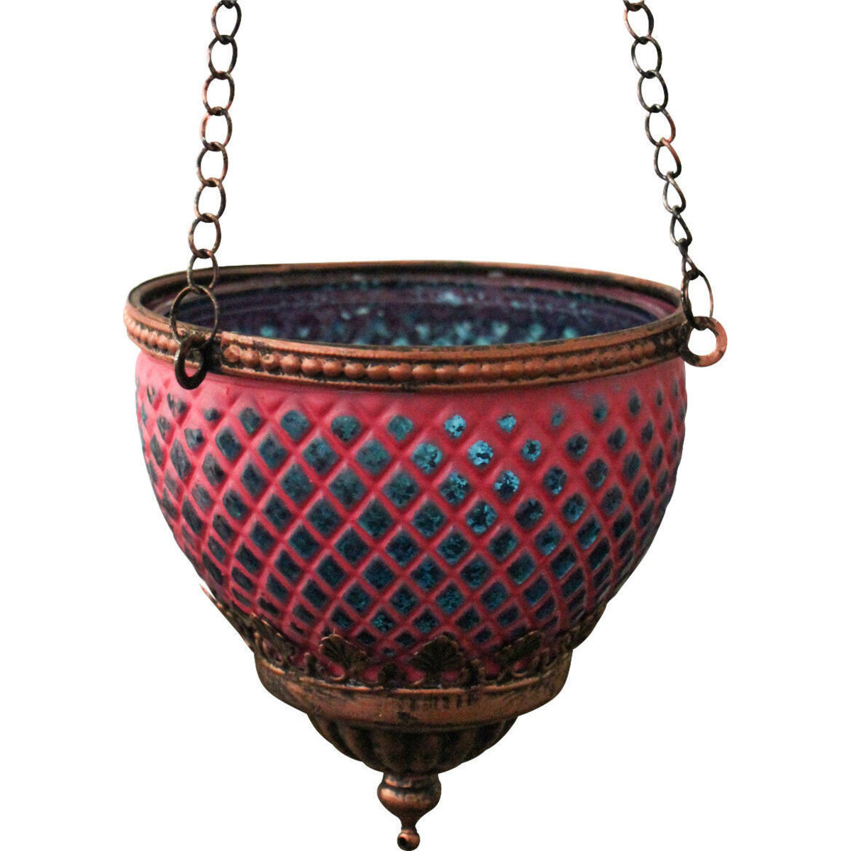 Votives are great means to build in mood lighting in your spaces-after all what would be better than the subtle glow of candles bringing out the best in your décor. Sublime in its illumination and delicate in its look, this glass and metal and wonder is a replica of the Moroccan style lamps that must have graced the homes in Marrakesh, the delightful play of colour and pattern makes it all the more special. Its size is the right kind -suited to pillar candles or even the more squatter round candles that will easily fit into its receptacle. The hangable votive is easy to suspend from the ceiling and if placed a little low, will illuminate the space with a wonderful mellow kind of glow. Of course, the colours too will play its part in making things around rather attractive. The copper coloured upper and lower frame and the pink and aqua colours too are magnificent in their rich and royal look.