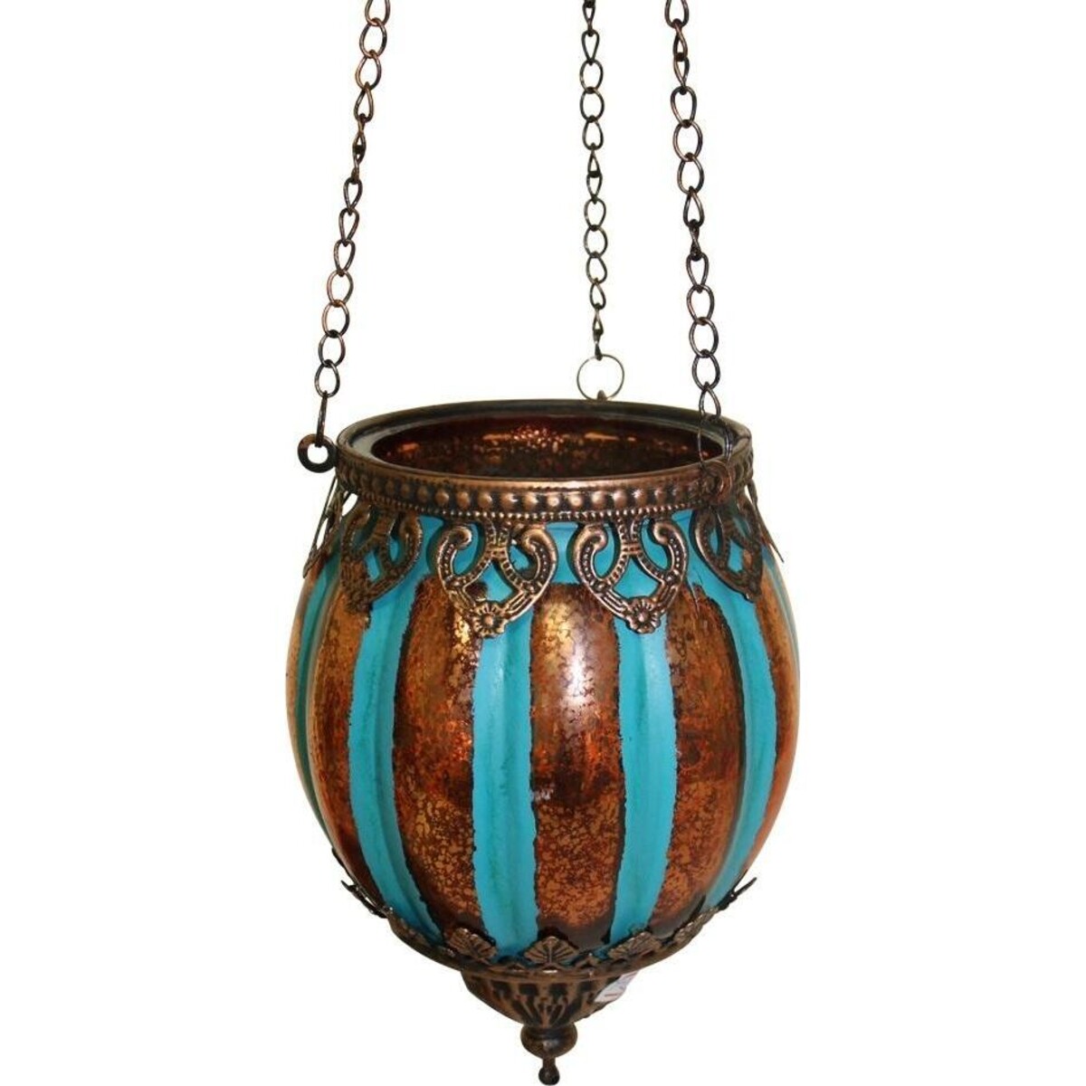 The vibrant colour of the glass meets the glint of metal-the obvious mid-eastern reference in design and style setting the mood to an indulgent and luxurious mode. The votive has a presence that will add to your home?s oriental appeal and the hangable features will help lend the same look to your outdoors if the setting needs to be created there. The tiny votive is a mere 11 cm in height and dimeter while its chain would have length of around 16 cm adequate to help suspend it easily. Could be sued as much for your regular lighting ? all you would need would be tea lights to set inside. It would also look stunning when there are occasions like anniversaries and the like. After all it is in creating illumination highlights that your décor emerges in its true kind of beauty. It has been crafted from heat resistant glass- and copper coloured metal that combines fabulously with the bright turquoise of the glass.