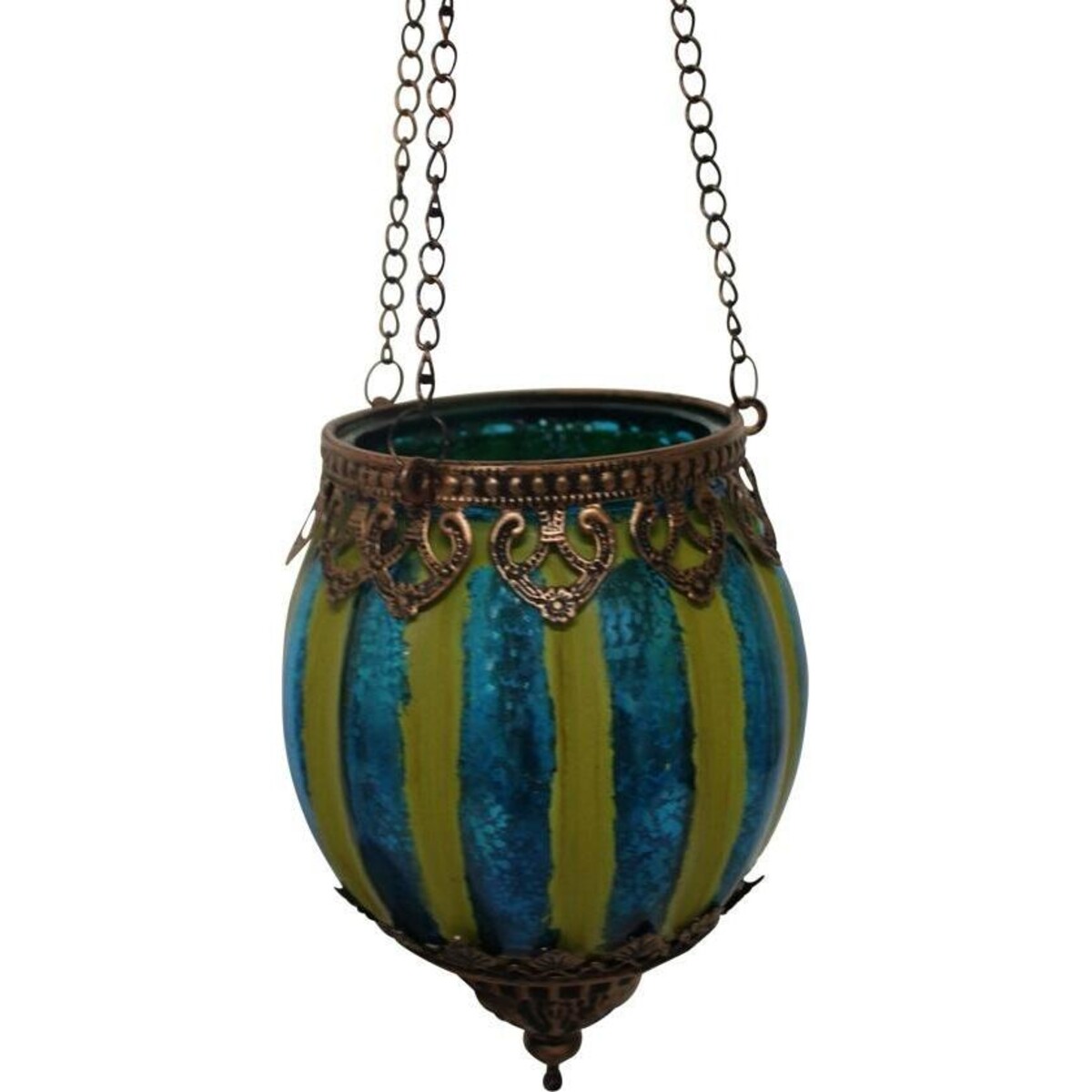 The colours are what catches your eye-the henna green and the dull indigo on the glass merging into the copper shade or the metal frame-the chain hanging is attached at three places to the glass goblet that houses the tea light. This is an ancient means to add light to one?s spaces and has made quite a comeback after centuries of being in oblivion, thanks t the interest in things heritage and vintage in style. Great for adding to your Boho or Moroccan setting. When not lit up in the mornings, the delightful design of the hanging votive will lend the space an artisanal kind of beauty owing to its beautiful handcrafted nature. Add such delightful votives at various level in clusters or in three and fours for a more impactful décor highlight. The height of the goblet holding the tealight is all of 11 cm while its total height including the chain is around 17 cm. The metal frame in a burnished copper colour looks sensational at the top and the bottom of the votive showcasing the finest in metal design.