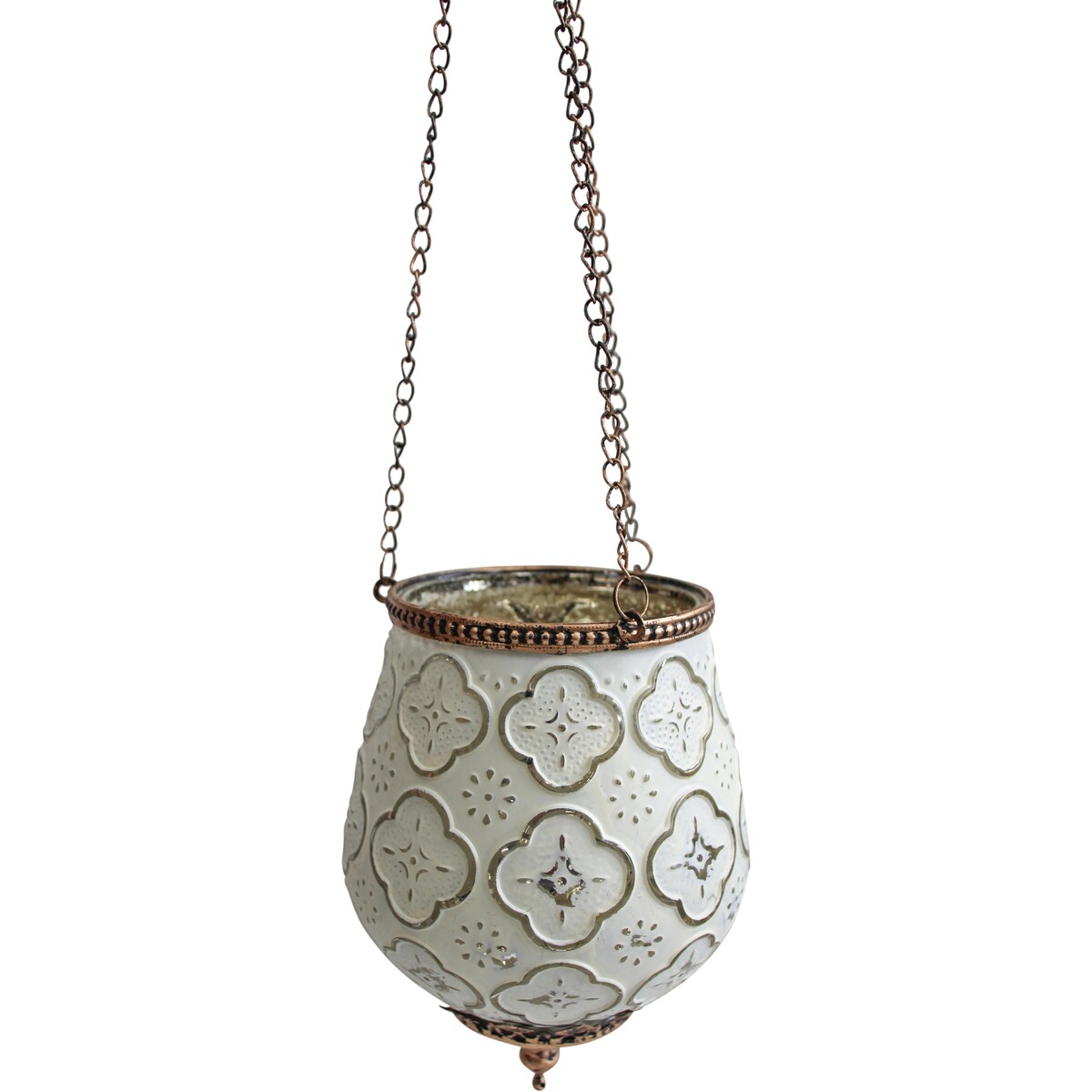 Illumination plays a critical role in lending your home the most important proof of its exquisite nature as when the right aspects of the décor are bathed in candle light, they assume an aura of beauty quite unique. Such lamps which behave like receptacles of candles work like a charm when you wish to introduce the right kind of ambiance and mood. Made of sturdy glass, its heat resistant and large enough to host a medium sized pillar candle in its interiors that is 15 cm high. The open upper body will allow one to place the candle with much ease. The mercury glass like interiors has a silvery speckled shimmer that adds to the beauty of its washed in white exterior showing off the white quatrefoil pattern. The lamp is suspended from three chains made of metal and can be placed high up or brought lower according to your need. In fact, you could pace several of these at different levels for a more profound décor impact. The patterned body of thus lamp will look especially pleasing when placed in corners where they will create more depth and a layered kind of feeling.