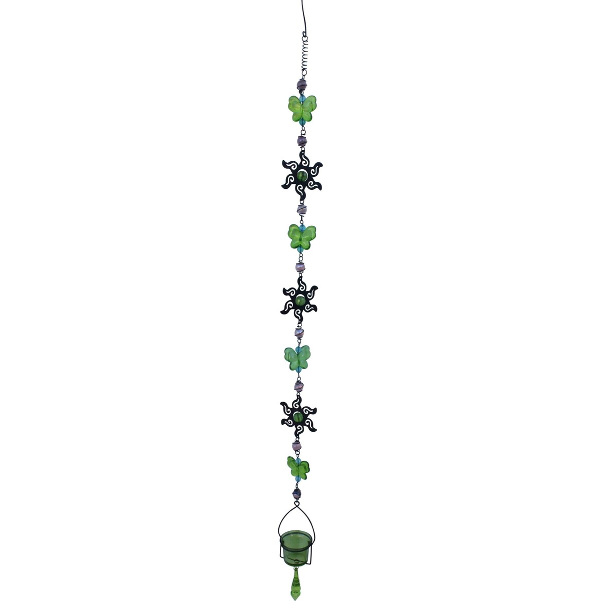 This unique and hanging candle holder puts a new meaning to multipurpose home d??cor and functional aesthetics. It could be hanged anywhere in the house to provide a chic and somehow rustic appeal with its metal and crystal ensembles. The intricate decoration is made with a coiling metal effect and alternately hanging effects of crystal butterflies, pearl and metal sun-shaped accents. The blue circular crystals accentuate the green butterfly shaped crystals in between two delicate off white pearls put in place with the metal coils. Hanging below is the rustic metal sun-shaped d??cor with circular green accent at the center. This design of the Hanging Votive Butterfly alternates each other in a set of three culminating with a green candle holder at the bottom with a pupa shaped crystal hanging at the bottom.