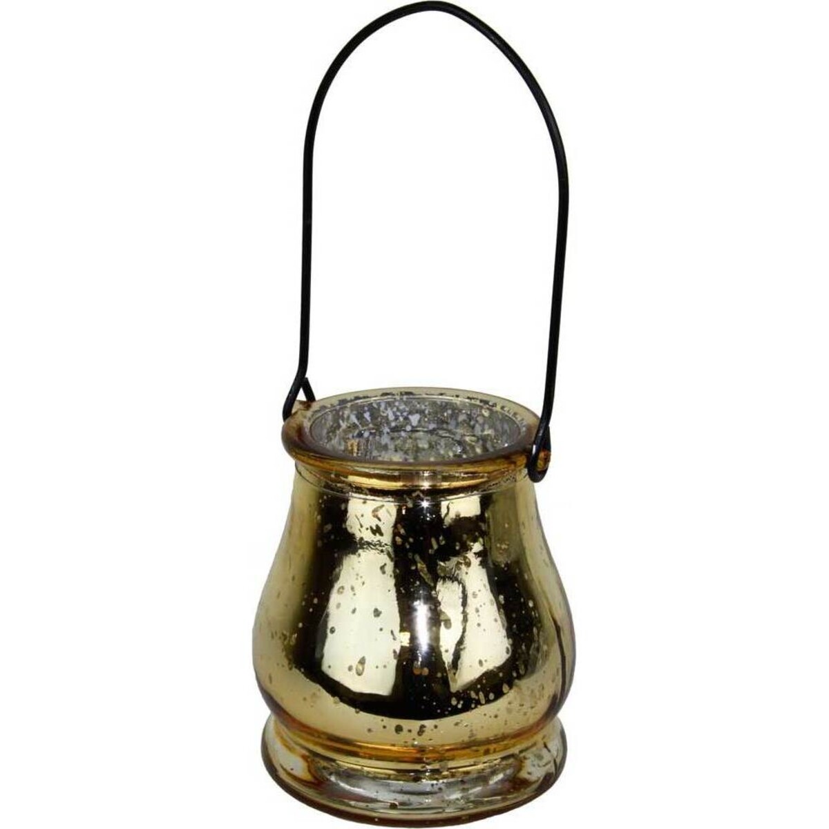 The product Hanging Votive Mercury Gold has dimensions of 8x8x10 cm, featuring shiny, Mercury - Gold glass body on the exterior. The interior section contains glass container for holding a votive candle. This illuminating device has a metallic hook attached to the top that provides convenient usage. Sanctuaries of worship may place orders for several of these units at a time to have them positioned at various strategic places for efficient lighting and serenity during devotional moments. Hanging Votive Mercury Gold presents with a touch of elegance and would look brilliant within any worship setting.