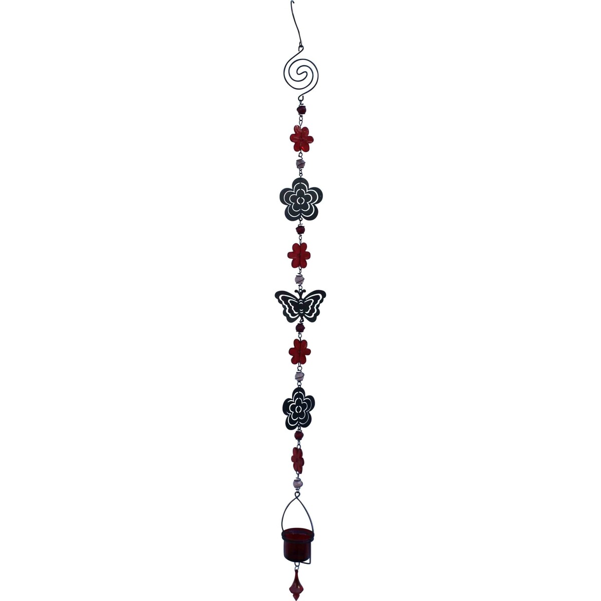 This hanging candle holder is definitely out to boost home aesthetics with a remarkable function for lucrative purposes. The item is made with a blend of fine materials from the supporting metal to the faux pearl and crystals. It is a perfect choice for nature-inspired and floral home themes owing to its wide array of crystal and metal flowers in alternate cascade. The floral-shaped crystal is accentuated in red hue while the black metal flowers complete the design. The Hanging Votive - Red Flowers candle holder is lavishly combined with red and off white faux pearls and butterfly-shaped metal in black accents. To complete the finely crafted hanging home d‚Ä?cor is the deep red candle holder at the bottom of the cascade held in place by the black metal construction with red hanging crystal below.