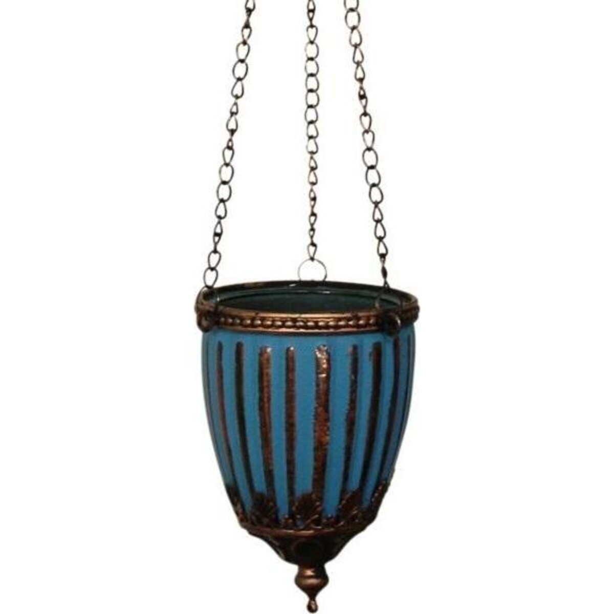 Our decorative candle holder has a ribbed blue glass body with antique gold highlights that amplify its cozy ambience when lit. This elegant piece is accentuated by the metal embellishments around its rim and bottom and will look divine if hung from the windowsill, mantlepiece or high above on bare branches of trees. Accompany it with embellishing string lights, tinsel, rustic star garlands or beautiful floral or vegetative arrangements. It can be used both indoors and outdoors with real or battery operated tea lights to provide a subtle lighting effect. Hang multiple of these as a part of coastal or vintage themed wedding decorations by alternately filling with flowers and candles.
