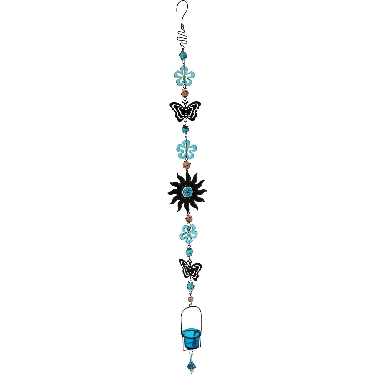 Hanging Votive Sun Butterfly, measures 6x13x115 cm. There is a hook at the top which facilitates hanging at suitable points. A network of dull - coloured butterflies and blue artefacts are inter - connected alternately within this votive instrument. At the middle of this product lies a sun - shaped artefact, with the candleholder positioned near the bottom section. Hanging Votive Sun Butterfly mainly comprises of blue and dull - toned artistry, making it appear somewhat captivating to behold. Glass and metal are the materials employed for designing the diverse crafts exhibited on this item. Both parties of individuals and institutions can acquire several of these for personal and public devotional usage.