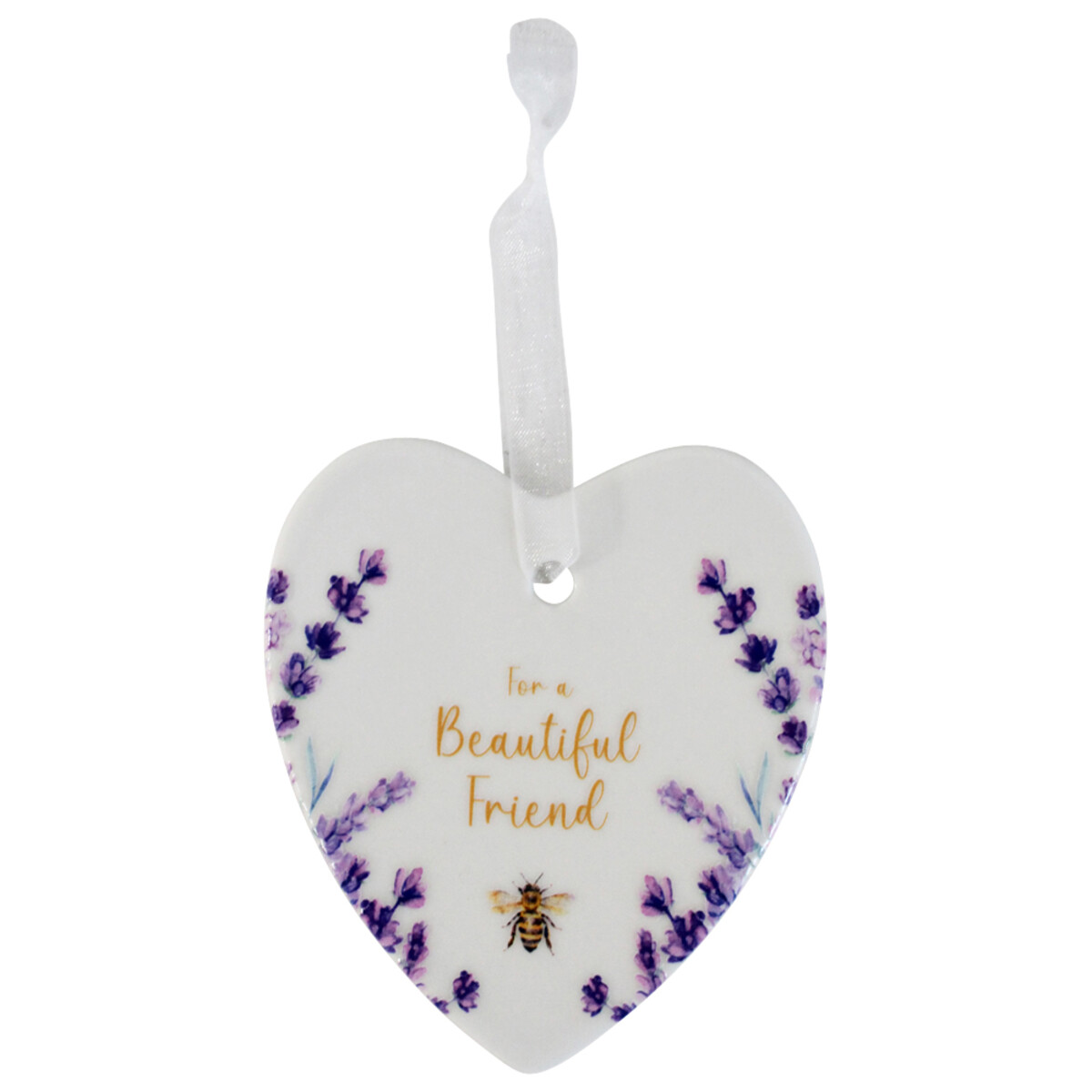 Our Heart Beautiful Friend hanging plaque is just the sweetest little gift. Featuring a lovely watercolour floral design with a bee and the message, 'For a beautiful friend,' this ceramic piece is perfect for gifting to show appreciation and love. The gentle purple tones and heart shape make it a truly touching gesture - and with its compact 8x9cm size, it looks great anywhere from a desk to a wall or bedside table.