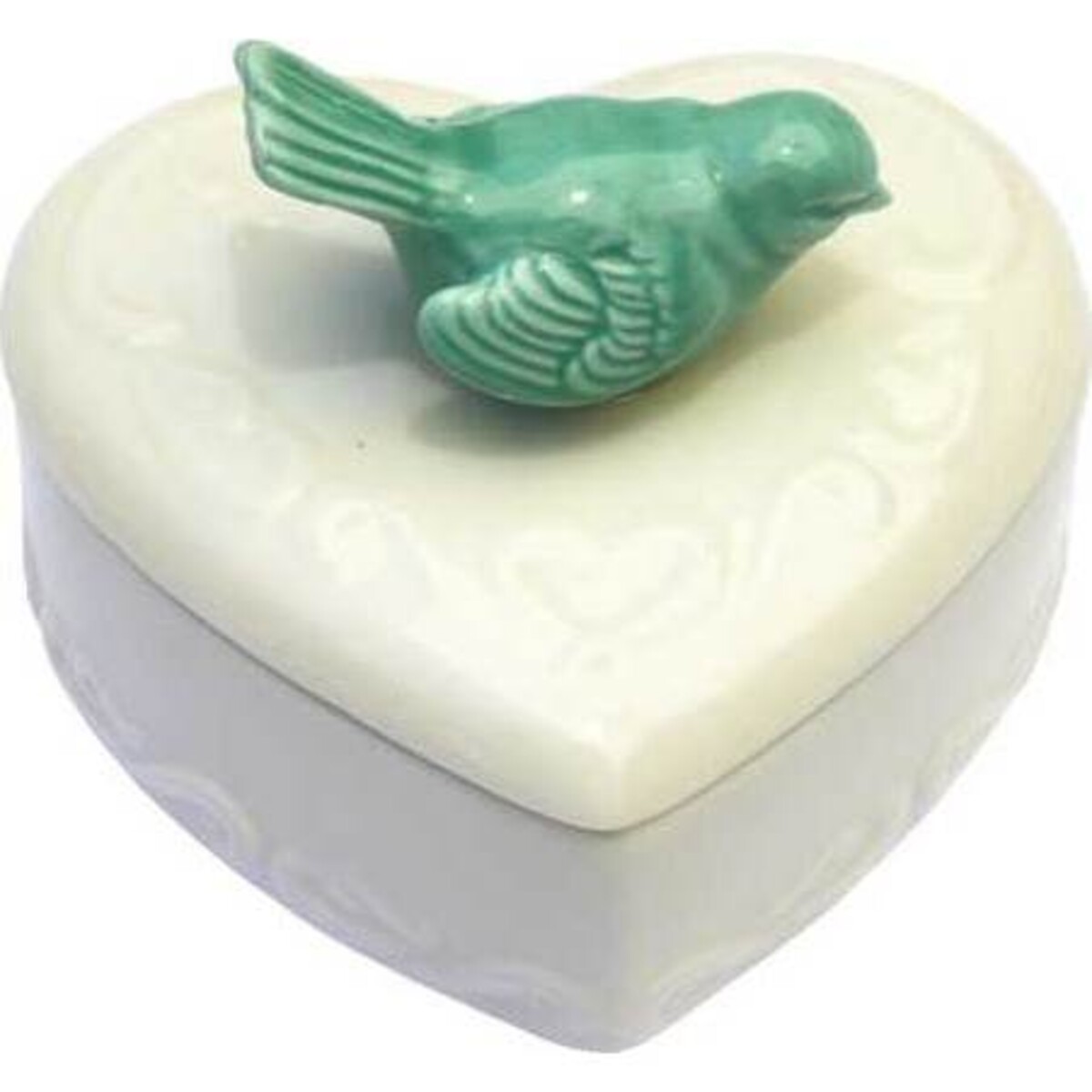 Introducing the Large Heart Bird Box from Lavida. This exquisite piece features a white heart base with a turquoise elegantly detailed bird sitting right on top as he guards all the treasures inside. This box is large enough that it can hold a variety of items from small candies to rings, it's small enough that it won't take up a lot of space whether you have it on your bathroom counter, bookcase, or dresser. They also make excellent gift ideas for almost any occasion ranging from a graduation to a baby shower.