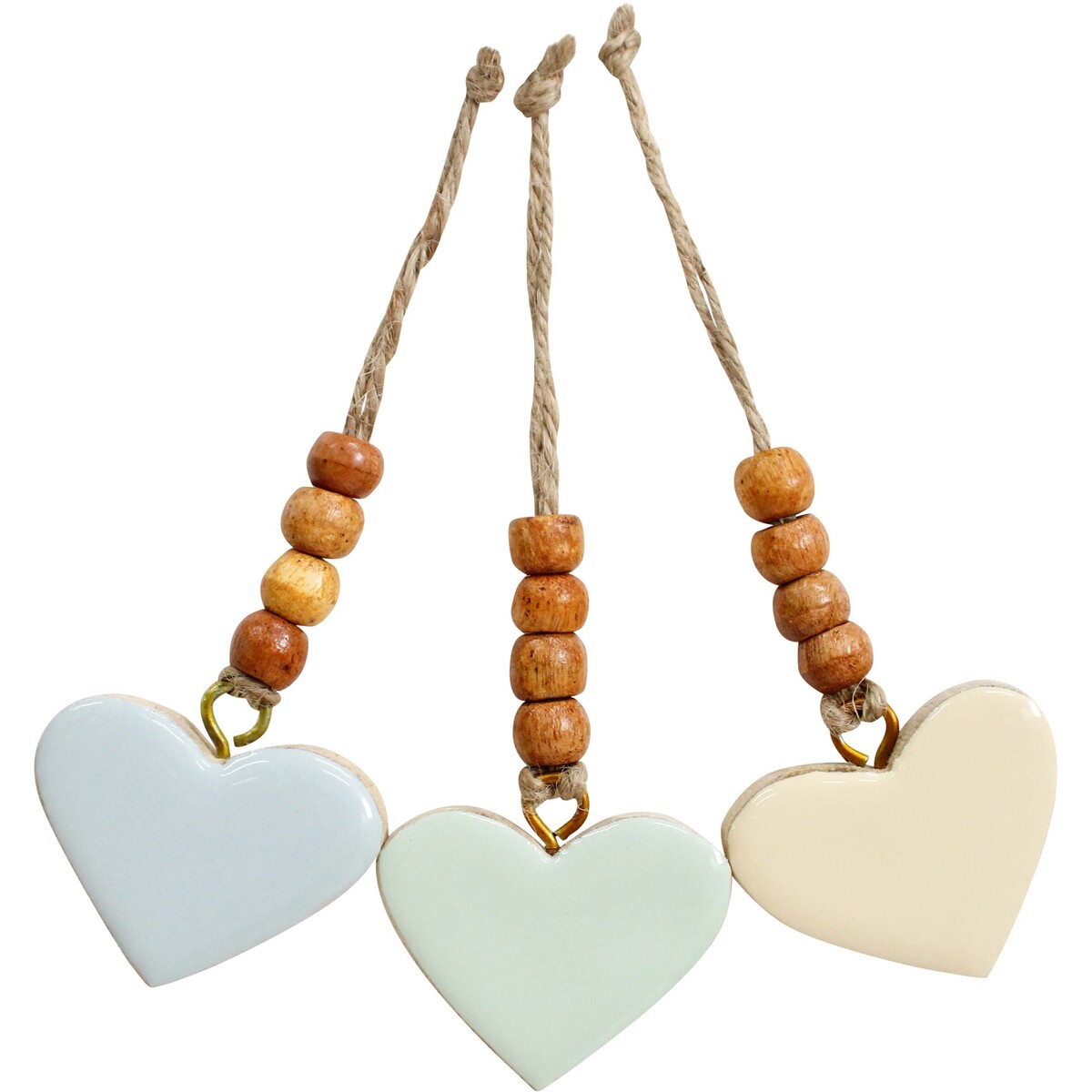 We absolutely love these petite pastel blue heart ornaments for a handful of reasons. They're as versatile as they are attractive, and that classic shape never goes out of style. Each little heart is handcrafted from mango wood, so every one is unique - some might have a different grain pattern or finish, but that's all part of their charm, not a fault at all. At 4.5x1x2cm plus hanger, they're just the right size for a few different uses. We see them as sweet accents on a shelf or doorknob in the home, and they look especially lovely as decorations in a nursery or even as wedding favours. Their subtle pastel blue blends into both modern and traditional decor easily too - that gentle tone can soften up a minimalist room, but also adds a bit of vintage feel if needed. And they're not just pretty - with those natural rope hangers and wooden beads, they look organic and handmade - making them feel quite special as gifts or to add warmth to any space.