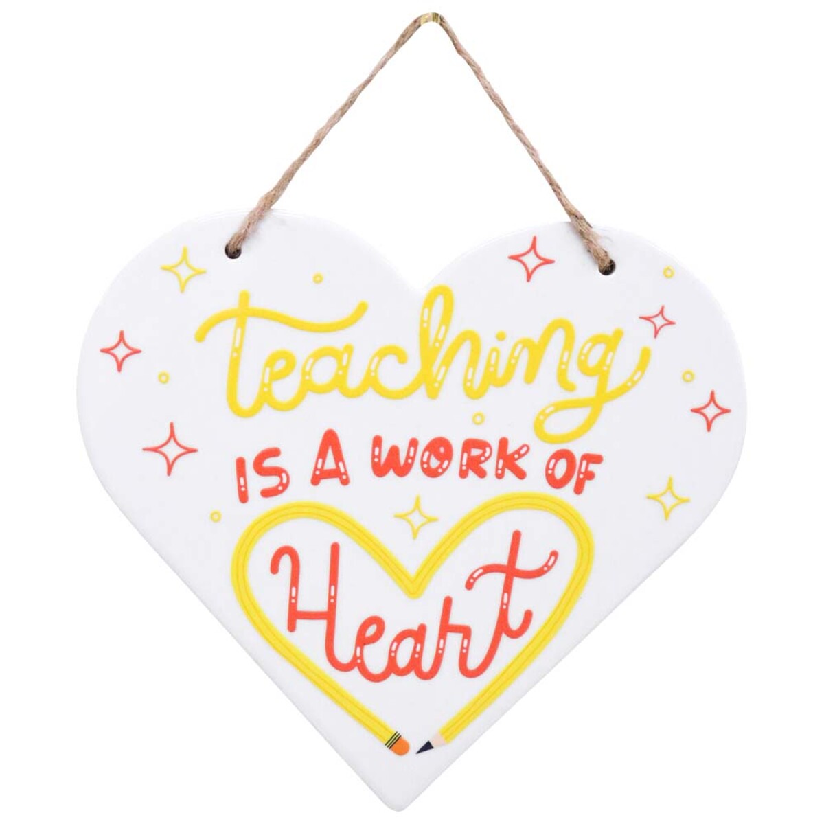 The slightly oversized ceramic heart sign is simple, fresh, and quirky - with yellow and red typography set off by small, hand-drawn stars and shapes. “Teaching is a work of Heart” speaks for itself but the heart around “Heart” is outlined in a pencil line, which brings it back down to earth and makes it fun.