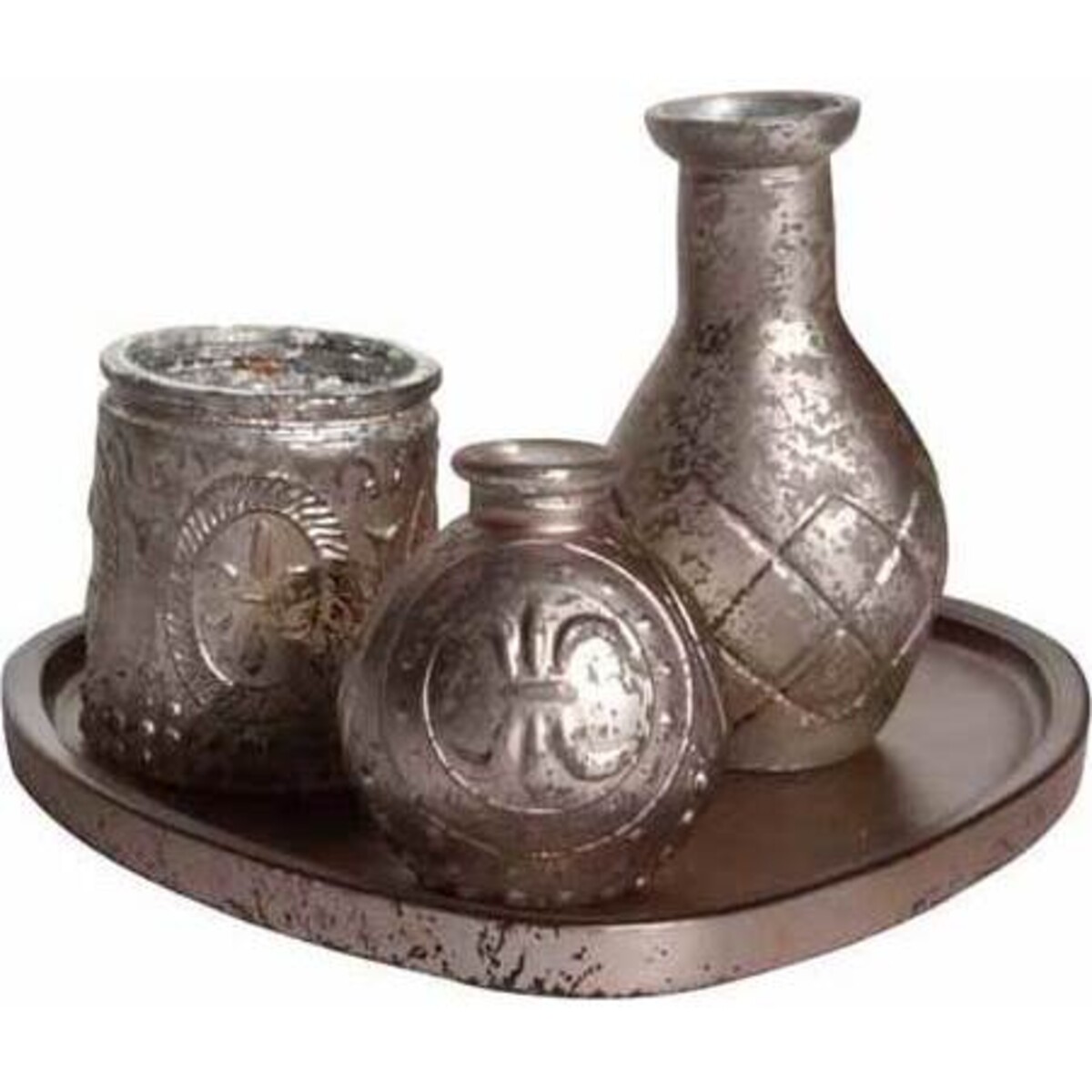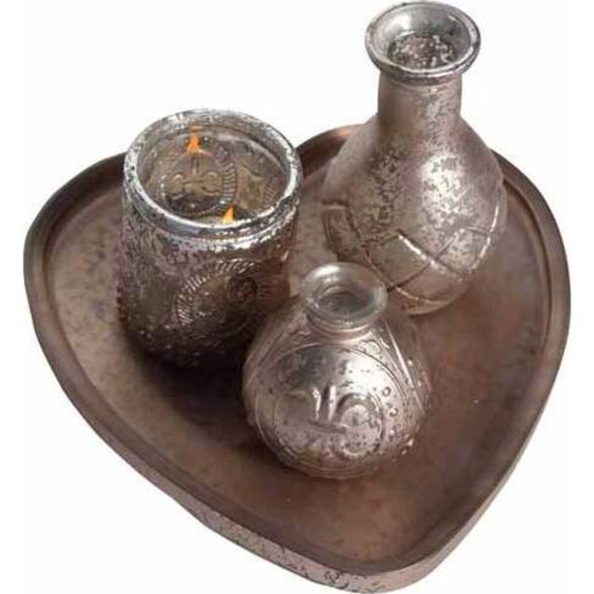 The Heart Tray with Bottles - Deco Silver consists of four silver pieces. First, there is the flat, heart-shaped tray. Then there is a container which resembles a thick beer can, embossed with medieval like markings on the side. Finally, there are two bottles - one is short, with a round vessel and a short neck and other looks more like a flask since it is taller, with a more ovoid receptacle and a long and narrow neck. The markings on the various containers look ancient, giving the pieces an old, antiquated feel. However, the monochromatic, dull silver colour makes it perfect even in more contemporary interior design. Although this can be functional, as receptacle for various kitchen ingredients, it would still be better as decoration.