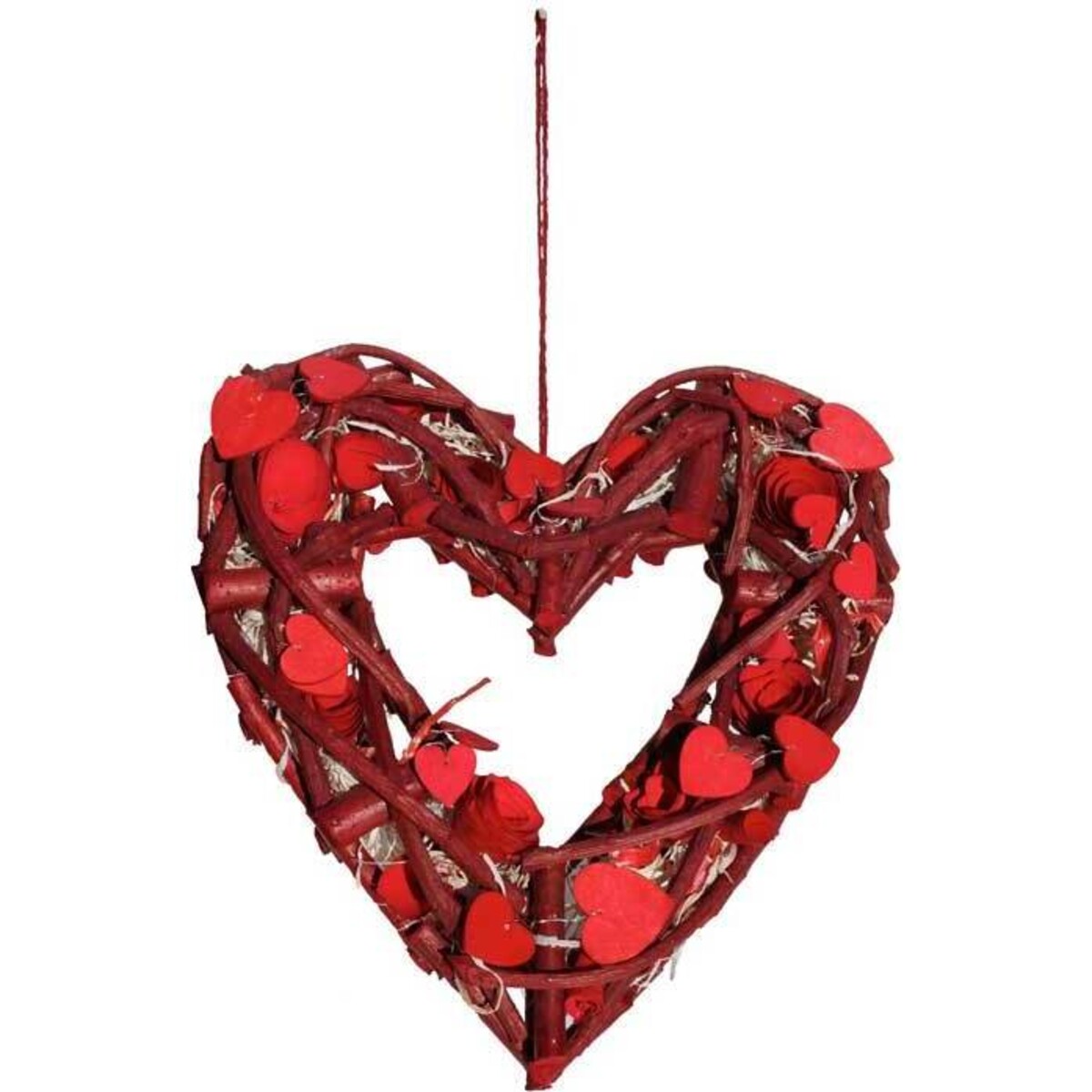 • Wooden hearts are painted in rose red and are scattered and layered throughout and around the large heart wreath
