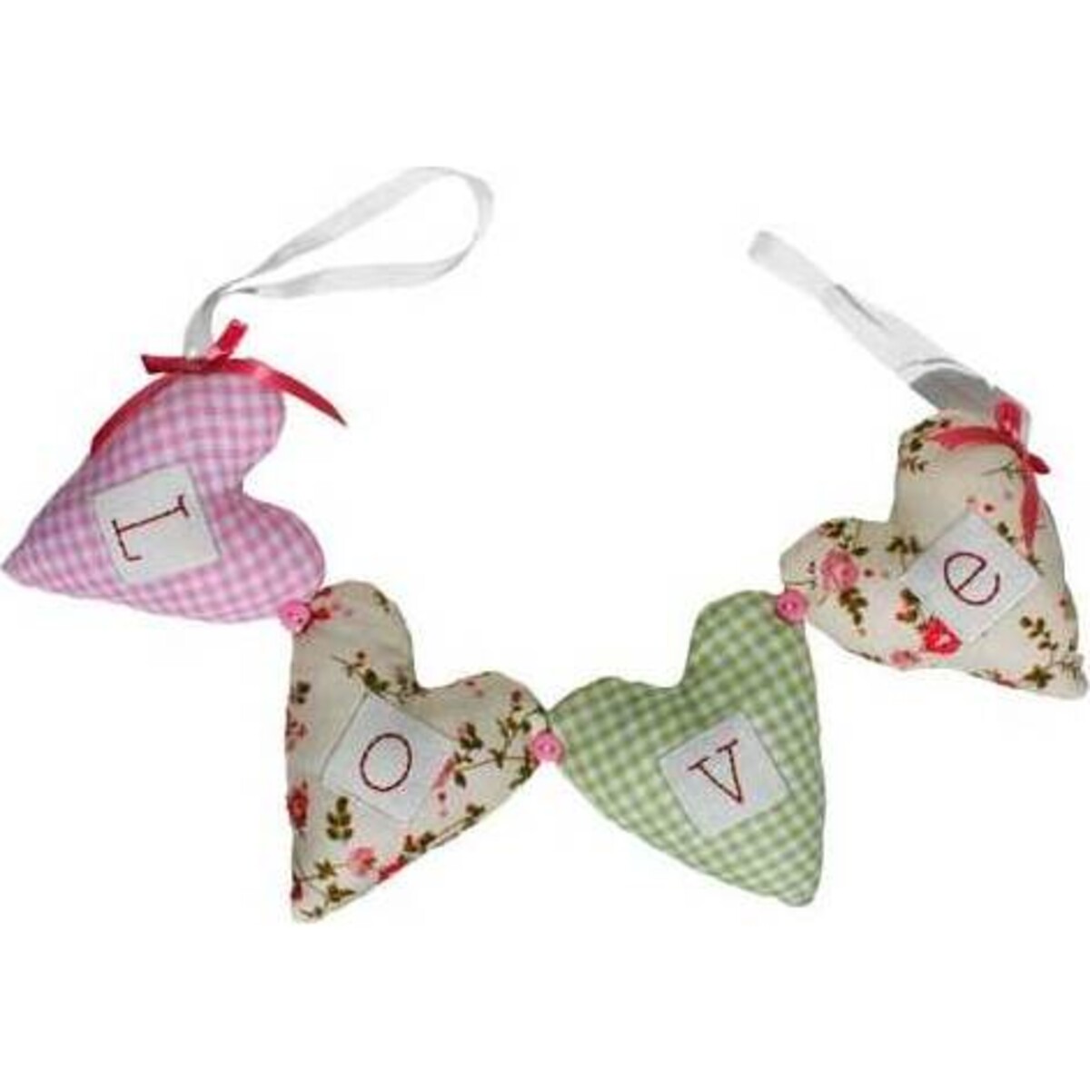 The Hearts on Ribbon?Love ornament is a wonderful accent to have in just about any environment. This decoration can be utilized in just about any environment from hanging it up on walls, to baby cribs. This piece would make a great gift for a number of people. The Hearts on Ribbon?Love cushion is made up of 4 heart cushions that are individually designed to perfection. Each heart has its own unique quilt-like design with the letters L-O-V-E stitched to each heart. The piece is then brought together by two ribbons at the ends of the hearts that are also utilized as connection points to wherever your customers intend to attach this ornament. Such wonderful arrangements of arts and crafts are exactly what customers are looking for to decorate their homes or give away as gifts. Cushions such as these could in fact hold future sentimental value to prospective customers who are looking to find that perfect gift for their loved ones. The Hearts on Ribbon?Love cushion should certainly be an item that every person should have.