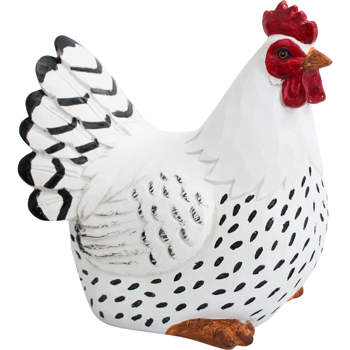 Right, so Hen White is one of those pieces we think is going to stop people in their tracks - it’s just so striking. The design is bold and cheerful, with that classic chook shape and the crisp contrast between the white body and black speckled feather details. At 21x12x20cm, it’s got a nice solid presence for a kitchen bench or shelf. And being made from resin, it’s sturdy but not too heavy if someone wants to move it around. We really like that the hand-painted finish has a lot of character - little quirks in the strokes so every piece ends up just a bit different.
