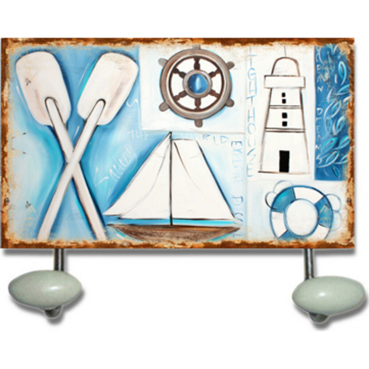 The Hook - Blue Oars is a stylish wall hanger that also works as a fine decoration. While most wall hangers simply feature a 'hook', this one also features a rectangular painting-like attachment. If you have seen the Clock - Blue Oars, the featured drawing is similar.