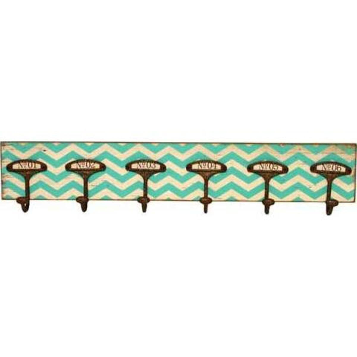 The horizontal set of hooks features a blue and white chevron background with metal rounded hooks, each of which has a number written at the base. The pieces are weathered and aged to give them a lovely and charming vintage look, and many are going to think you plucked the right from an estate sale. Don't worry, we'll keep your secret about where you really got them. From your bathroom to the foyer, place them anywhere around your home where you could use a little function and style.
