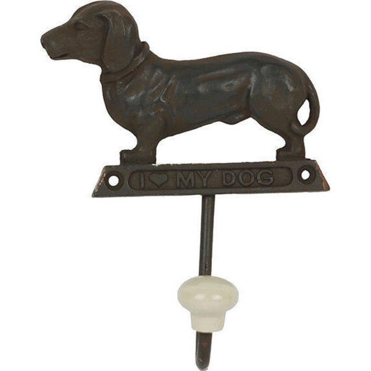 Hooks are needed almost in all parts of your home and what could be better than this statement piece which declares your love for your dog like few things can. Made of metal, crafted with love and a little concern for detail, this sturdy hook features a lovely dachshund, with its squat structure, its tiny legs and the typical ears and tail making it the most endearing little accent for your wall. The hook is tipped with a round fabric guard so that you could hang even the most delicate of articles without fear of damage. The hooks can be placed with ease on the wall. Its dark colour antique feel in its look and the words on it etched not just on it but across your heart as well - as it says - I love My Dog! The 10 cm high hook has a length of 9 cm and the single prong has a width of 4 cm. You could add several such decorative hooks on the wall especially in the kids room where the wall needs things more endearing and fun.