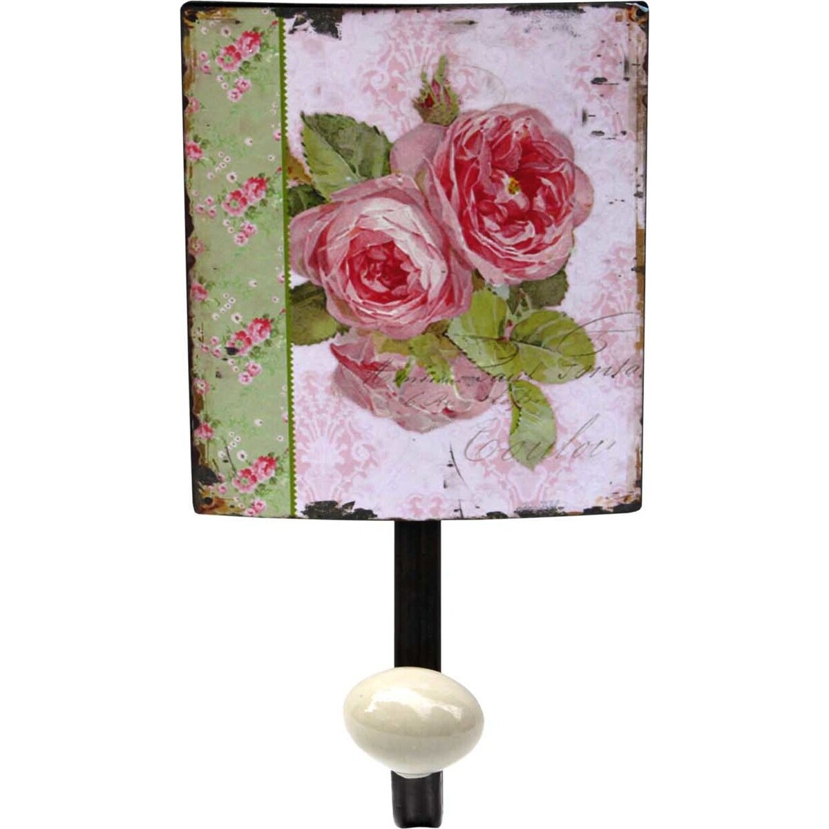 The Delicate Rose hook has the air of multimedia or arts and crafts as it looks almost like a collage made of wall paper with a bit of calico on the side. The majority of the image accommodates the blossoms. It is stained to resemble a piece of old parchment. An iron hook protrudes from the base of a squat piece of art. The hook is covered with a white knob. It is affronted with some faint calligraphy in the appearance of an attractive watermark. The background is a checkerboard pattern of pale pink fleur de lis. On the left a bunch of pink roses is scattered on to a field on green. The Delicate Rose hook would look fine holding a towel in the bathroom or a straw hat in a mudroom.