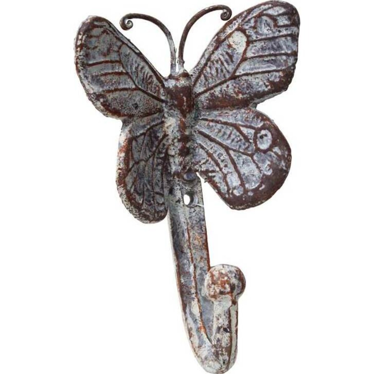 A detailed butterfly adds a bit of nature to the Hook Emboss Butterfly from LaVida. This metal hook features a butterfly at the top, embossed with details on its wings and body for a more realistic representation. Two narrow antennae complete the natural look. Extending from the bottom of the butterfly is a practical hook to be used for almost anything. Measuring 15 centimetres in length, this metal hook is rendered in an aged, distressed finish for vintage appeal. This hook is perfect hung along but would add more visual interest, and function, if mounted in pairs or groups.