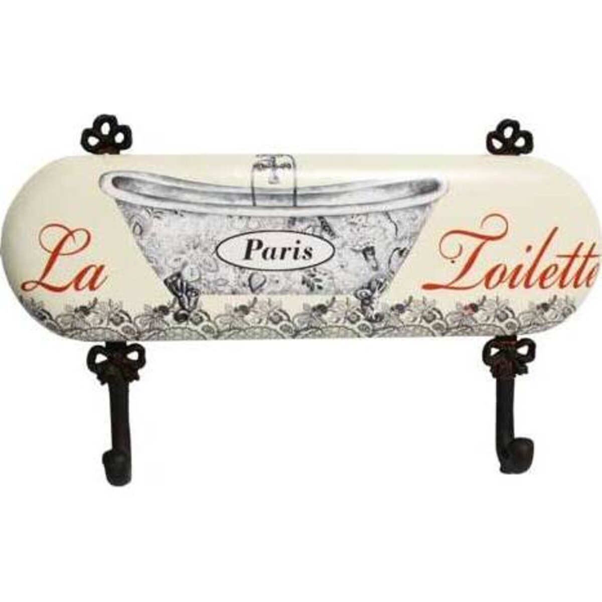 This traditionally stylish set of hooks has delicate patterning at the base of the main body and on a quaint bath depicted in the centre. The colours of this item, cream, black, and red are in keeping with a style of yesteryear, adding to the romance and mystique of the item. "La Toilette" is imprinted at either side in gorgeous italics, whilst the word "Paris" appears at the center of the bath as a motif to add interest. As well as beautiful to admire, the hooks are highly practical and would make a useful addition to the bathroom from which to hand dressing gowns, towels, flannels, or any number of other items. The body of the item is formed in an attractive oblong that sturdily supports the black hooks that are fixed to the back, each styled with a pattern in keeping with the main artwork.