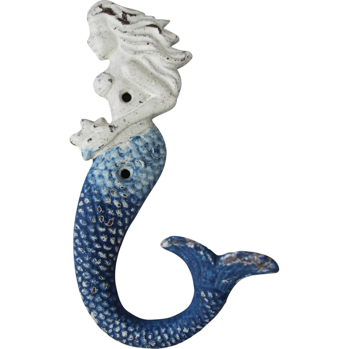 The single hook has been created innovatively from the upturned tail of the mermaid's lower body - the tall fin curves upwards and that gives the entire shape of the hook a unique kind of look. Mottled blue and white, the shape of the bracket is formed from that of the shape of the mermaid itself. The beauty of it lies also in its gorgeous colour and one of a kind look - flowing hair, a star fish in her hand and half of her body shaped like a fish. It is the kind of hook that anyone with a love for things shabby chic and marine, would love to flaunt, the single hook is defined well and will be able to take the weight of any heavy coat, satchel or the likes with ease. To keep it firmly placed on the wall, the mermaid has these two slots through which you could plant it on the wall. Add this touch of marine fancy as well as give your wall spaces at the same time build in more utility on your wall spaces.