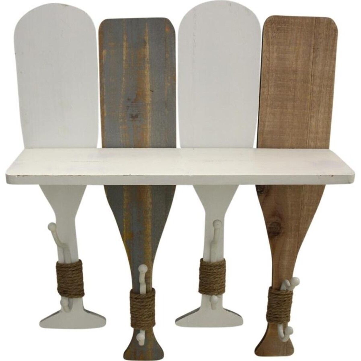 The usage of neutral colours is most subtle - browns, greys and white, sparkle and mingle with happiness - the distress rustic wood added to which is the rope tie up that adds ore to its basic design and unpretentious look. This shelf will help promote more organization and open up a space that could be used as much for display of accents as it could be for simply used for pacing important easy to reach for articles you could need every now and then. The bracket comes with hooks as well that have painted white and are placed at the base of the short - staffed oars handles. The dual prongs have rounded ends and the rope tie up lends them a look of utterly charming rusticity that modern homes would love to flaunt. Be it the entryway of your home, where itself you could show your love for this shabby chic or marine - this is going to be one of those accents cum organizational inclusion that will rake in plenty of compliments. The height of the piece is 58 cm while the length is all of 49.5 cm. Can be placed quite easily on the wall.