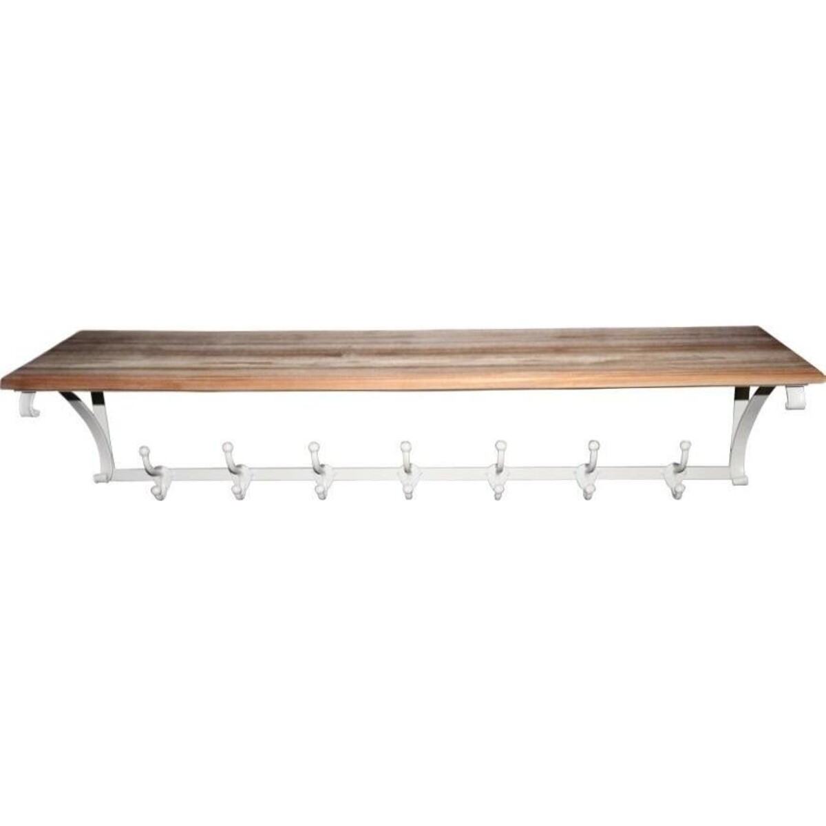 Made from metal and timber this shelf unit with its numerous hooks is the best means to dress your entryway wall by adding a delightful display on the shelf and at the same time helping those coming in the advantage of hanging with ease, their coats, jackets, scarves and mufflers - and even tiny articles like keys and the like. You could place it in the kitchen too and use it for hanging pans with handles or your apron and mittens. There are endless possibilities when you add shelves that come with this dual usage. A wonderful means to lend an organizational dimension to the wall. Adding beauty to the space would be so easy as the long 100 cm shelf is great for displaying potted plants and curios alike. You could use it in the children's room where the shelf could be used for books while the hooks can hold their satchels, jackets and the likes. The simple natural colour of the timber complements the white painted metal feature below. Sturdy and well designed the shelf has a width of about 22 cm and that lends it depth. The seven hooks have bene given rounded tips to ensure zero damage to clothing and fabric.