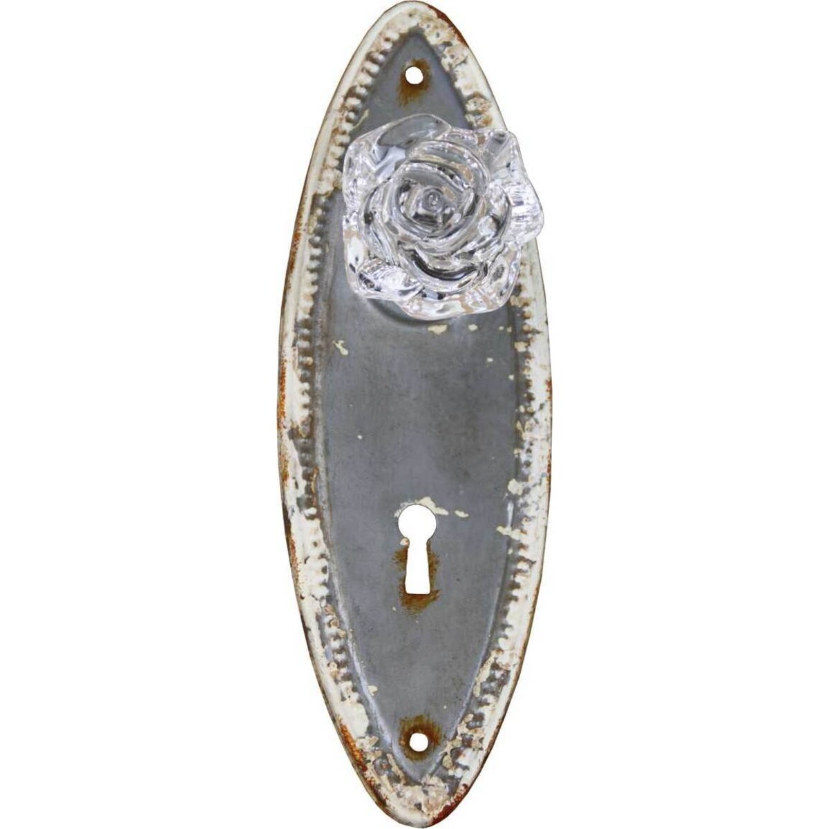 Created for impact this tiny little addition to the wall will ensure that you hangable articles like bags, satchels, scarves, and the lot look attractive while being placed at the right kind of space created for them. After all who likes to see mufflers, scarves, bags and umbrellas strewn all around and when you need to ensure that your home looks better organized you could count on this classic wall bracket with a single hangable glass bauble to come to your rescue. You could perhaps use it in conjunction with other vintage brackets and make quite wonderful accented wall with hooks in all kinds of shapes and looks. The oval shaped metal bracket is 18 cm long and seems to be a repurposed door key hole bracket. The hook itself is round, made of glass and the contrast of metal in such an antique look with the crystal made rosette is completely different in its look. And material usage which creates that gorgeous kind of contrast. The oval framed hook with delicate pattern along the edges and rust marks in a few spots can be placed with ease as slots for rivets are built into the design in two places.