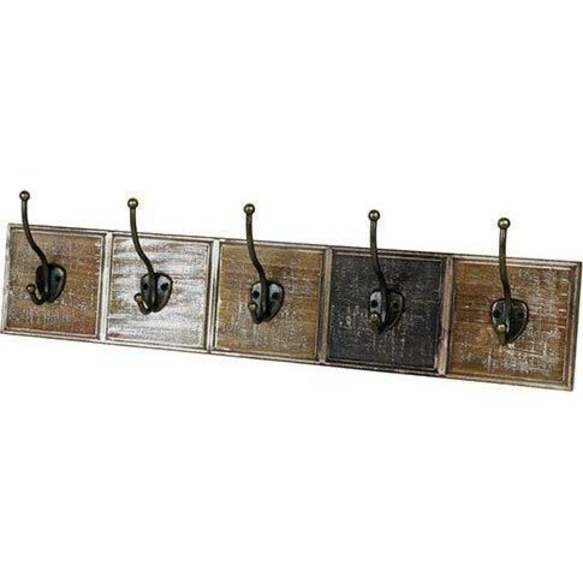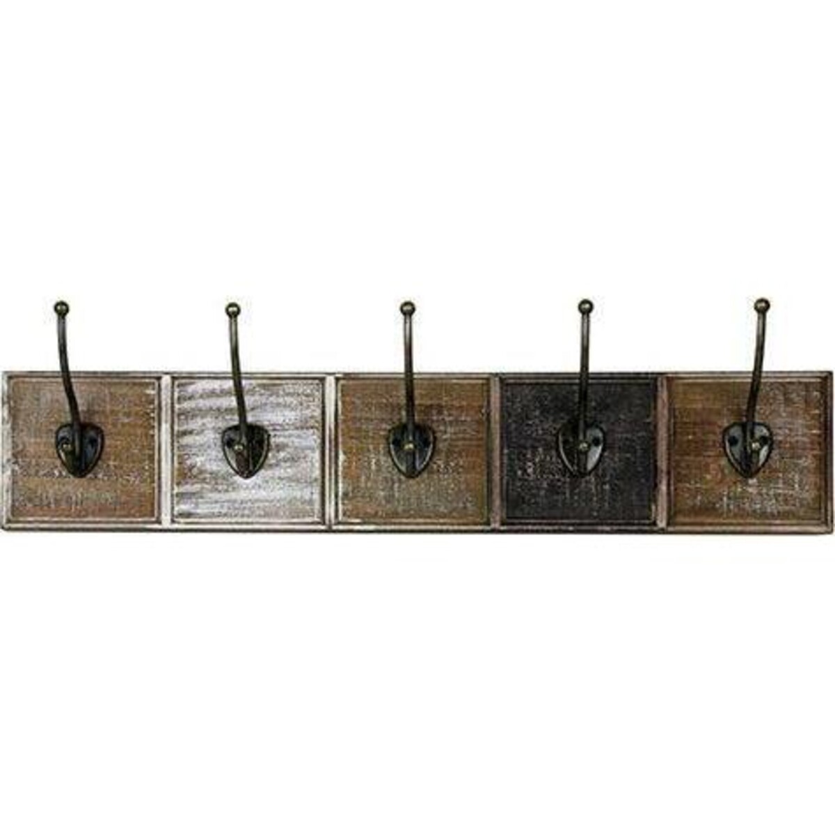 This alternate shaded wooden bracket lends this five dual pronged set of hooks its stylish looks. Very shabby chic in its overall appeal, the reclaimed wood look adds that shabbiness to its feature. The metal structuring of hooks has been created with view to allow adequate space between the prongs while the upper and the lower prongs too differ in size, the one above is sufficiently large to hook on to larger articles while the smaller one curves below eagerly awaiting usage for smaller articles. In all a composite set of hooks that can make organizing such a pleasure. Make this wonderfully simple yet elegant set of hooks part of any room and you could say bye bye to a lot of your clutter. Stable and steady, it can be fixed easily on the wall. 60 cm in length the bracket ahs a height of 15 cm making it a fairly large presence on the wall. Perfect for the kitchen, the winter closet or the children's room.