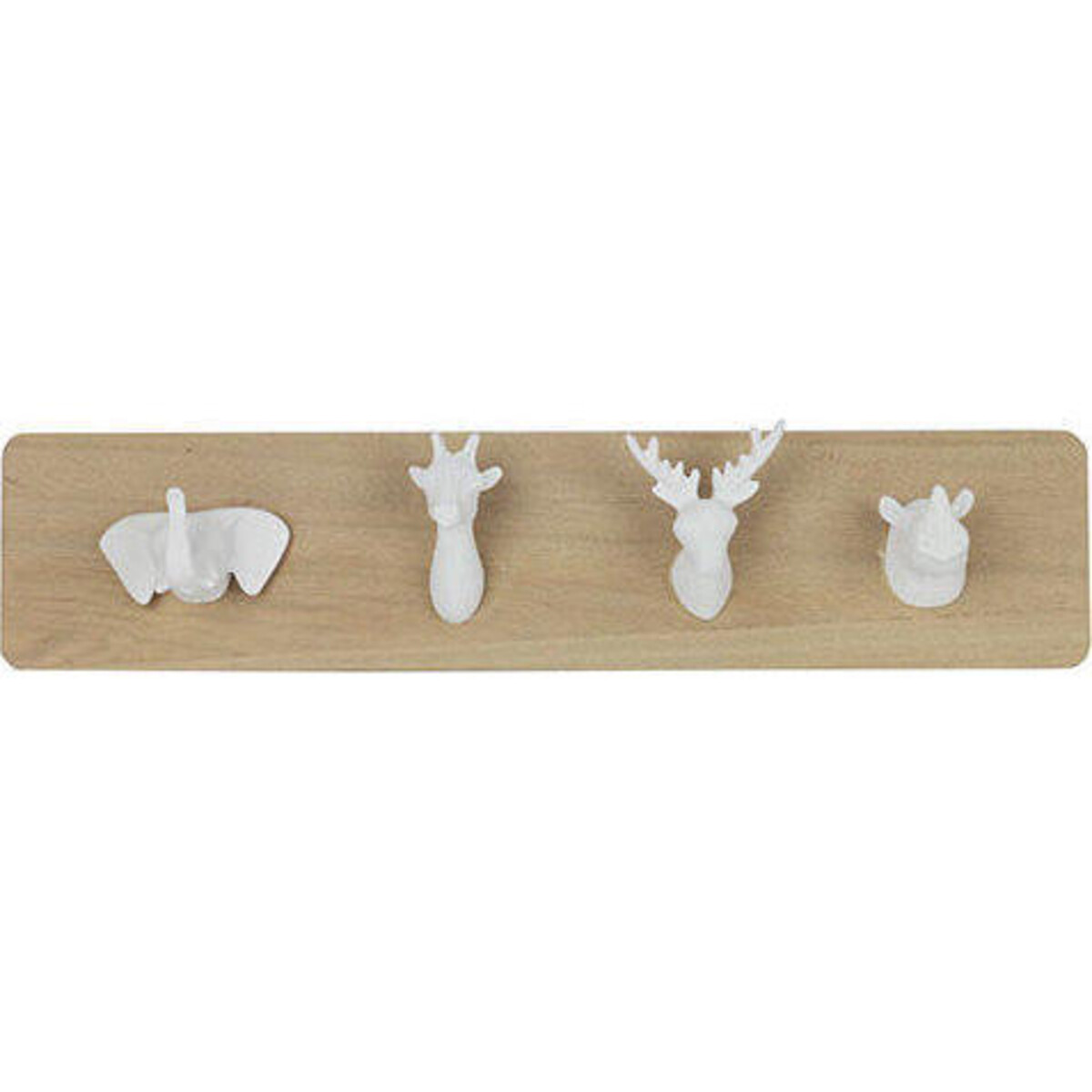 Things that are designed for utility need not only be drab and boring. At Lavida homes get a whole new feeling because of the manner in which even the most mundane of hooks get a whole new look. This set has four hooks placed on a wooden plank. The resin made hooks are shaped like heads of animals - a stag, a rhinoceros, a giraffe and an elephant makes it a perfect little prop for a child's room. It's so attractive that you would be attempted to add several of them - maybe in the washroom, behind the door or any space where you feel children tend to mess up by flinging around things that could be easily hung. Add this set of hooks and make a difference in terms of neatness and looks. Can be placed easily on the wall. The length of the bracket is 45 cm. The white coloured hooks are sturdy and have a depth of 8 cm, making them strong and large enough to hold on to satchels, jackets and even caps and heavier coats. The white coloured hook contrasts vividly with the base colour in wood brown.