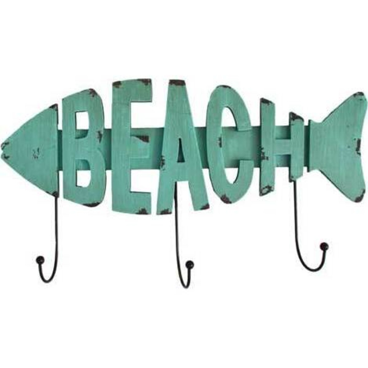 Quaint, old -world and definitely folksy-this wall hook set will take care of one's need for a coat hanging space ?the design is whimsically stylish and will fit into homes where the feel is vintage chic. The large enough hook bracket spans 54 cm across and is 30 cm in width and should be sturdy enough to take the weight of three coats. The material used is distressed metal and this kind of peeling paint effect is retro and very modern all at the same time. The shape of the fish and the lettering of the word ?Beach, in capitals, are two design elements that make this blue bracket so very attractive. It may be used near the umbrella stand or even in the children's room. This fabulous metal hook set is so very strong and sturdy that it ensures that one will not have the hooks getting distorted in shape with anything too heavy hanging from it.