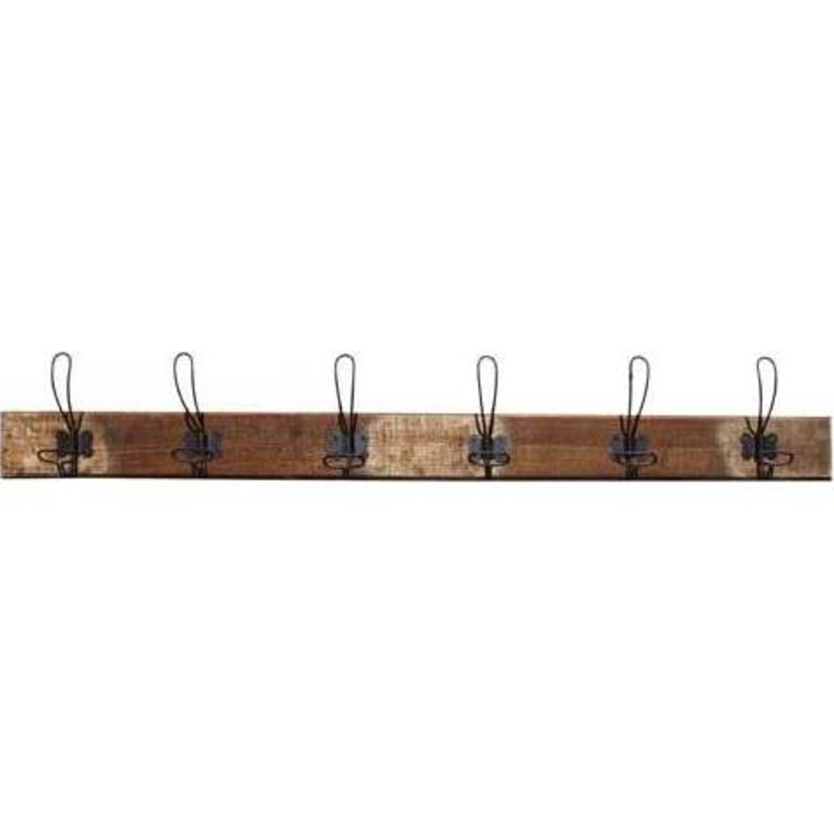 Hooks Bycle Rustic with dimensions of 64x10x23 cm, features a set of six metallic hooks with unique artwork at the base, supported on a rustic wooden base. They assume the shape of a U - shaped loop attached to the support material at the middle. The gadgets exhibit style, with the rustic form they exhibit being finely polished for an attractive finish. Homeowners can acquire them for use in different areas of the house, such as next to the staircase and inside bedrooms. Construction professionals can utilize them in communal bathrooms and hallways among other strategic locations to complement different country - house settings.