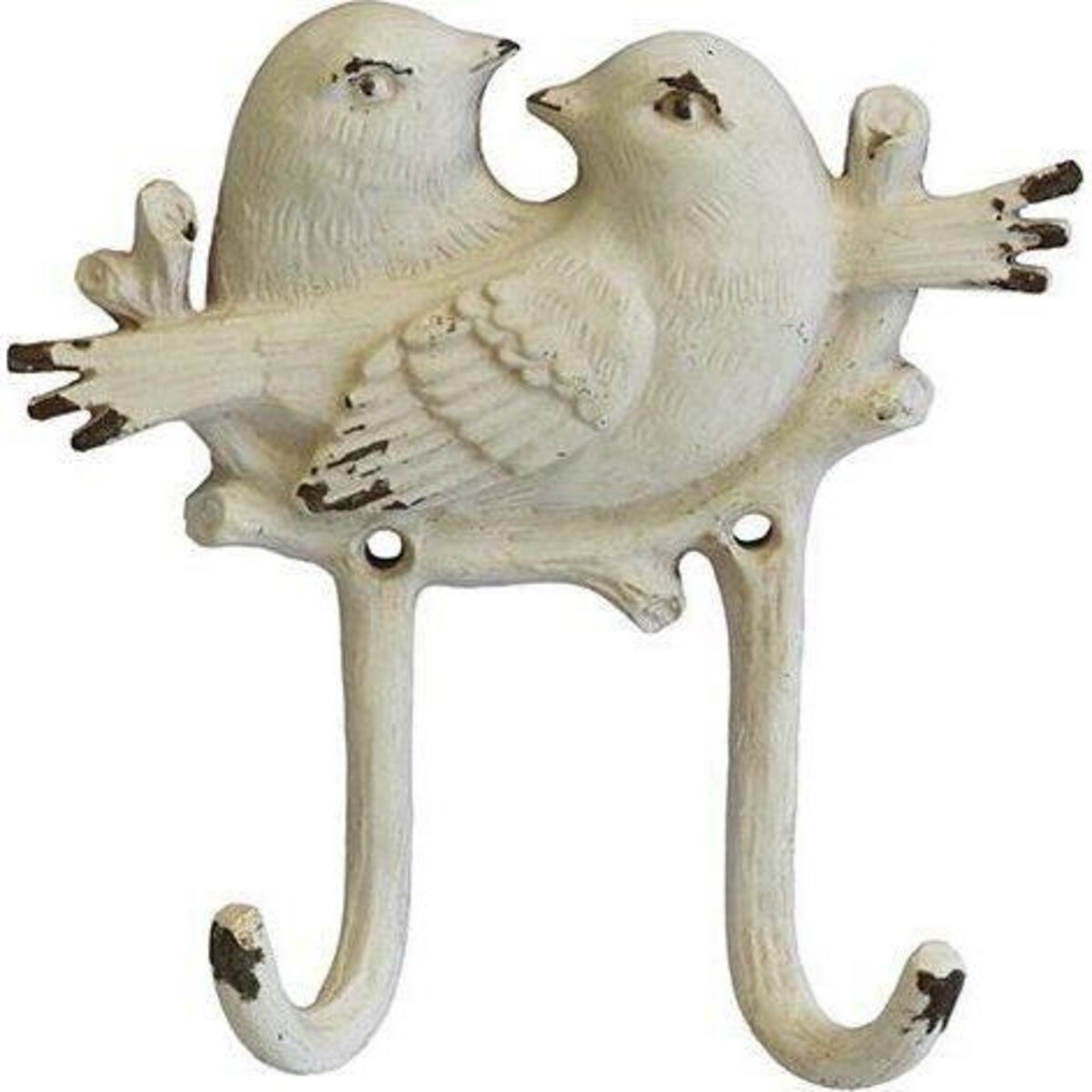 Shabby chic and very country and cottage inspired in its look, this tiny little 13 cm high wall hook has two chatting birds as the main motif of the design. The two birds turned face towards each other seem to be twittering away in abandon while they hold the two solidly created metal hooks. The hooks in themselves are placed next to each other but do allow ample space for things to be placed side by side. So if t is used in the bathing are - it would be great for hanging towels and clothes, but if in the kitchen or the entryway of the house it could be used differently - perhaps to hold, umbrellas, and coats. The placing of the hooks on the wall is rather simple. You could in fact places several of these in the kitchen in higher and lower positions on the wall to make quite an attractive display while they work hard at holding on to your things, sturdily. The hooks have prongs that are curved at the right angle so as not to allow any slippage of articles off the hook. They are 13 cm in depth, length and width.