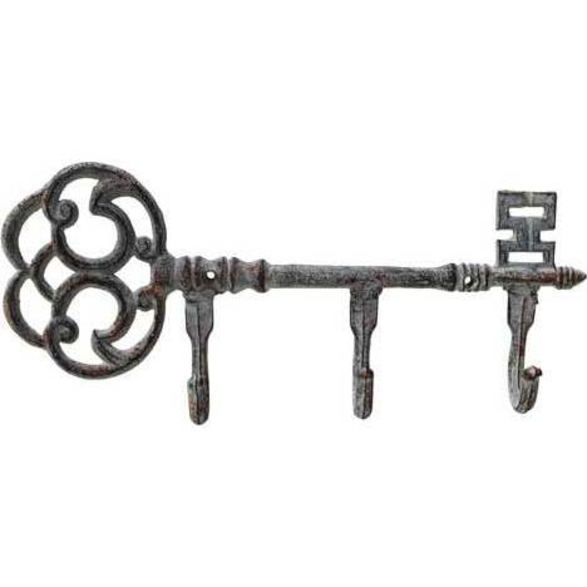 LaVida creates the quintessential key keeper with its Hooks Motif Key. This key - shaped wall accessory features three convenient hooks for storing car keys or any other entryway essentials. The key itself features an intricately embellished handle and classical, carved details that is reminiscent of an Old World design found in castles and estates from centuries ago. This wall hanging is rendered in an aged and distressed grey finish suggestive of hand carved stone or hand forged metal. Hung at an exit door or an entryway, this vintage - style key holder ensures keys find their way home every night.