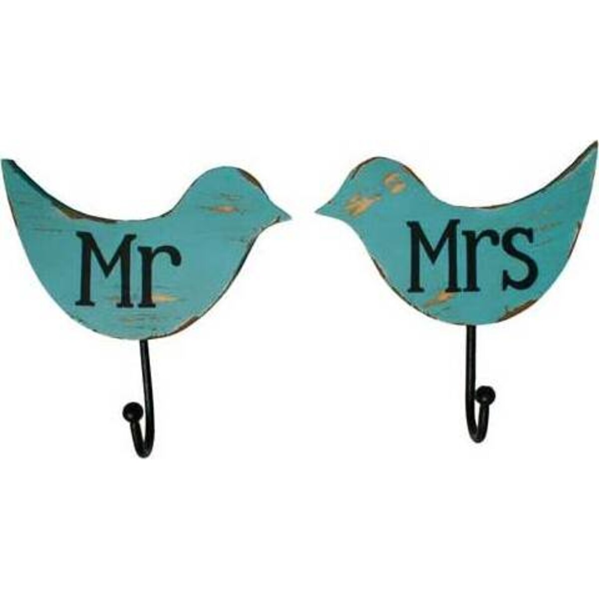 This humorous set of hooks is sure to generate a happy atmosphere whilst also providing a couple of useful hooks for coats, hats, tea towels, aprons, or pretty much anything that springs to mind. The solid design of each bird is complimented with an aquamarine colouring on the body and black for the hooks and "Mr and Mrs" lettering. The items have a rustic, natural feel and will be in keeping with many informal settings such at the kitchen, hallway, patio, or even the garden shed. Unfussy and easy to position, these household novelty hooks are an ideal addition to environments that need an extra lift or touch of mirth. Ideally, the birds should be close together, but depending on the type of items to be hung on the hooks, a slightly bigger separation is possible whilst maintaining the effect. Children will enjoy the bird shapes; mum and dad will admire the sentiment.